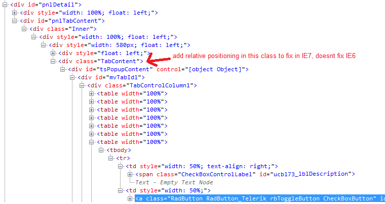 We've been able to fix IE7 by adding relative positioning to the containing block as per the link above, however the same doesn't seem to work in IE6. Our pages are generated dynamically, so i've attached the output source structure. In IE7, we can add relative positioning style to the 'TabContent' class to resolve the issue. In IE6, this doesn't work.