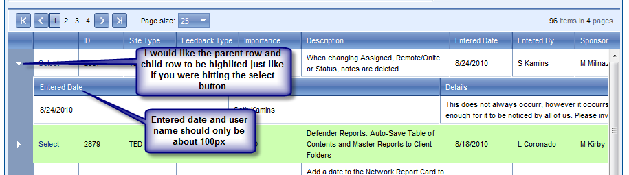 <telerik:RadGrid ID="rgFeedback" runat="server" Skin="Web20" DataSourceID="dsFeedback" AutoGenerateColumns="False" AllowSorting="True" AllowMultiRowSelection="False" AllowPaging="True" GridLines="None" PageSize="25" Width="100%" OnSelectedIndexChanged="rgFeedback_SelectedIndexChanged" OnItemCommand="rgFeedback_ItemCommand"> <MasterTableView DataKeyNames="FeedbackID" AllowMultiColumnSorting="True" HierarchyLoadMode="ServerOnDemand" Width="100%"> <CommandItemSettings ShowExportToWordButton="true" ShowExportToExcelButton="true" ShowExportToCsvButton="true" ExportToExcelText="Excel" /> <DetailTables> <telerik:GridTableView DataKeyNames="FeedbackDetailID" DataSourceID="edsDetails" Width="900px" runat="server"> <ParentTableRelation> <telerik:GridRelationFields DetailKeyField="FeedbackID" MasterKeyField="FeedbackID" /> </ParentTableRelation> <Columns> <telerik:GridBoundColumn HeaderText="Entered Date" DataField="EnteredDate" DataFormatString="{0:d}" HeaderStyle-Width="90px" ItemStyle-Width="90px"> </telerik:GridBoundColumn> <telerik:GridTemplateColumn HeaderText="User Name" HeaderStyle-Width="90px" ItemStyle-Width="90px"> <ItemTemplate> <asp:Label ID="FirstName" runat="server" Text='<%# Eval("User.FirstName") %>'></asp:Label> <asp:Label ID="LastName" runat="server" Text='<%# Eval("User.LastName") %>'></asp:Label> </ItemTemplate> <HeaderStyle Width="100px" /> </telerik:GridTemplateColumn> <telerik:GridTemplateColumn HeaderText="Details"> <ItemTemplate> <asp:Label ID="Comments" runat="server" Text='<%# Eval("Comments") %>'></asp:Label> </ItemTemplate> </telerik:GridTemplateColumn> </Columns> </telerik:GridTableView> </DetailTables> <ExpandCollapseColumn Visible="True"> </ExpandCollapseColumn> <Columns> <telerik:GridButtonColumn Text="Select" UniqueName="Select" CommandName="Select" HeaderStyle-Width="50px" ItemStyle-Width="50px"> </telerik:GridButtonColumn> <telerik:GridBoundColumn HeaderText="ID" DataField="FeedbackID" ReadOnly="true" HeaderStyle-Width="50px" ItemStyle-Width="50px"> </telerik:GridBoundColumn> <telerik:GridBoundColumn HeaderText="Site Type" DataField="FeedbackSiteType" ReadOnly="true" HeaderStyle-Width="60px" ItemStyle-Width="60px"> </telerik:GridBoundColumn> <telerik:GridBoundColumn HeaderText="Feedback Type" DataField="FeedbackType" ReadOnly="true" HeaderStyle-Width="75px" ItemStyle-Width="75px"> </telerik:GridBoundColumn> <telerik:GridBoundColumn HeaderText="Importance" DataField="FeedbackImportance" ReadOnly="true" HeaderStyle-Width="75px" ItemStyle-Width="75px"> </telerik:GridBoundColumn> <telerik:GridBoundColumn HeaderText="Description" DataField="Description" ReadOnly="true" HeaderStyle-Width="200px" ItemStyle-Width="200px"> </telerik:GridBoundColumn> <telerik:GridBoundColumn HeaderText="Entered Date" DataField="EnteredDate" DataFormatString="{0:d}" ReadOnly="true" HeaderStyle-Width="75px" ItemStyle-Width="75px"> </telerik:GridBoundColumn> <telerik:GridBoundColumn HeaderText="Entered By" DataField="UserName" ReadOnly="true" HeaderStyle-Width="75px" ItemStyle-Width="75px"> </telerik:GridBoundColumn> <telerik:GridBoundColumn HeaderText="Sponsor" DataField="Sponsor" ReadOnly="true" HeaderStyle-Width="75px" ItemStyle-Width="75px"> </telerik:GridBoundColumn> <telerik:GridBoundColumn HeaderText="Status" DataField="FeedbackStatus" ReadOnly="true" HeaderStyle-Width="75px" ItemStyle-Width="75px"> </telerik:GridBoundColumn> <telerik:GridBoundColumn HeaderText="Developer" DataField="AssignedDeveloper" ReadOnly="true" HeaderStyle-Width="60px" ItemStyle-Width="60px"> </telerik:GridBoundColumn> <telerik:GridBoundColumn HeaderText="Start Month" DataField="StartMonth" ReadOnly="true" HeaderStyle-Width="75px" ItemStyle-Width="75px"> </telerik:GridBoundColumn> <telerik:GridBoundColumn HeaderText="End Month" DataField="EndMonth" ReadOnly="true" HeaderStyle-Width="75px" ItemStyle-Width="75px"> </telerik:GridBoundColumn> <telerik:GridBoundColumn HeaderText="Dev Hours" DataField="TimeEst" ReadOnly="true" HeaderStyle-Width="60px" ItemStyle-Width="60px"> </telerik:GridBoundColumn> <telerik:GridBoundColumn HeaderText="% Complete" DataField="PercentComplete" DataFormatString="{0:P0}" ReadOnly="true" HeaderStyle-Width="60px" ItemStyle-Width="60px"> </telerik:GridBoundColumn> </Columns> </MasterTableView> <PagerStyle Position="TopAndBottom" /> <HeaderStyle Width="100px" /> <ClientSettings> <Scrolling AllowScroll="true" UseStaticHeaders="true" SaveScrollPosition="true" ScrollHeight="500px" FrozenColumnsCount="5"></Scrolling> </ClientSettings> <ExportSettings ExportOnlyData="true" IgnorePaging="true" OpenInNewWindow="true" HideStructureColumns="true" Pdf-PageBottomMargin=".5" Pdf-PageTopMargin=".5" Pdf-PageLeftMargin=".5" Pdf-PageRightMargin=".5" Pdf-PaperSize="Legal" Pdf-PageWidth="356mm" Pdf-PageHeight="216mm" /> </telerik:RadGrid>