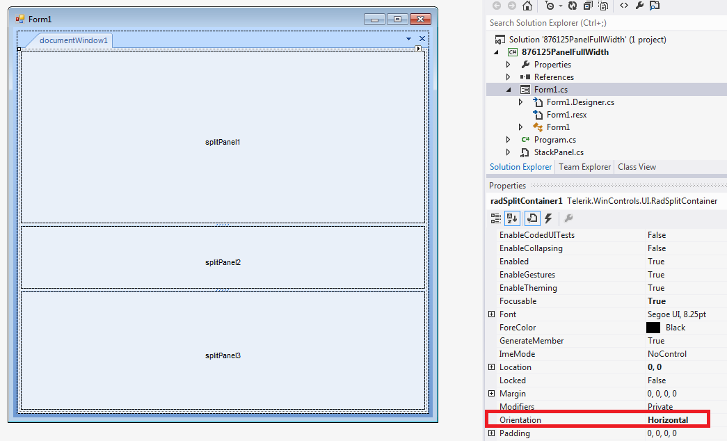 RadSplitContainer is composed of split panels which fill the entire RadSplitContainer's width. When resizing the main container, the inner panels are also resized. This is desired behavior. It is possible to resize the split panels via dragging the splitter. However, you can stop this functionality by setting the SplitterWidth property to 0. Thus, the inner panels will size themselves such that they automatically fit their content but do not allow a user to expand/contract them.