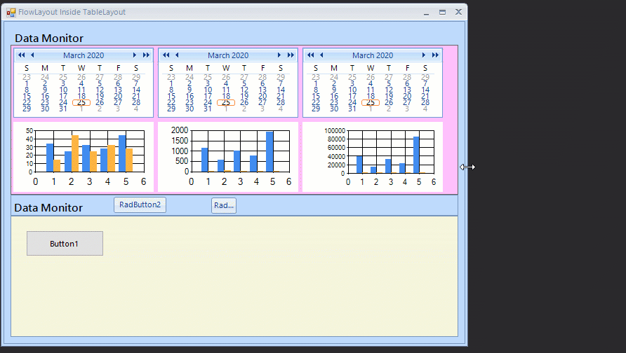 I tried replicating this with the splitcontainer (2 panels) but could not get the top splitpanel to resize based on the flowlayout resizing, no matter what I did - I set the splitpanel size based on the flowlayout size on resize but this did not work. Is it possible to achieve the illustrated layout with any Rad controls?
