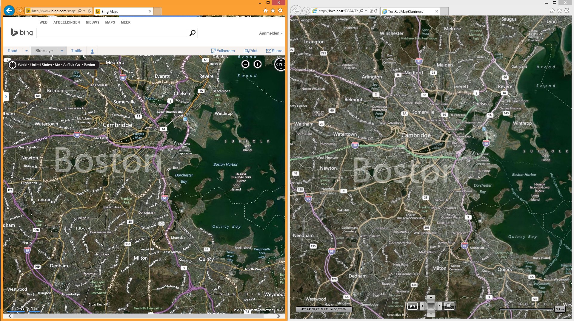 The Silverlight version of the RadMap control has been fixed as well. Please, take a look at the screenshots attached. One is from IE and the second is from a RadMap for Silverlight. You can see that the maps look identical in both cases and there is no blurriness.
