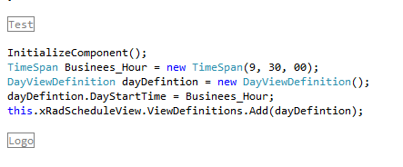 The following topic in our documentation describes how to set DayStartTime and DayEndTime properties of the ScheduleView ViewDefinitions in XAML as well as in code-behind: