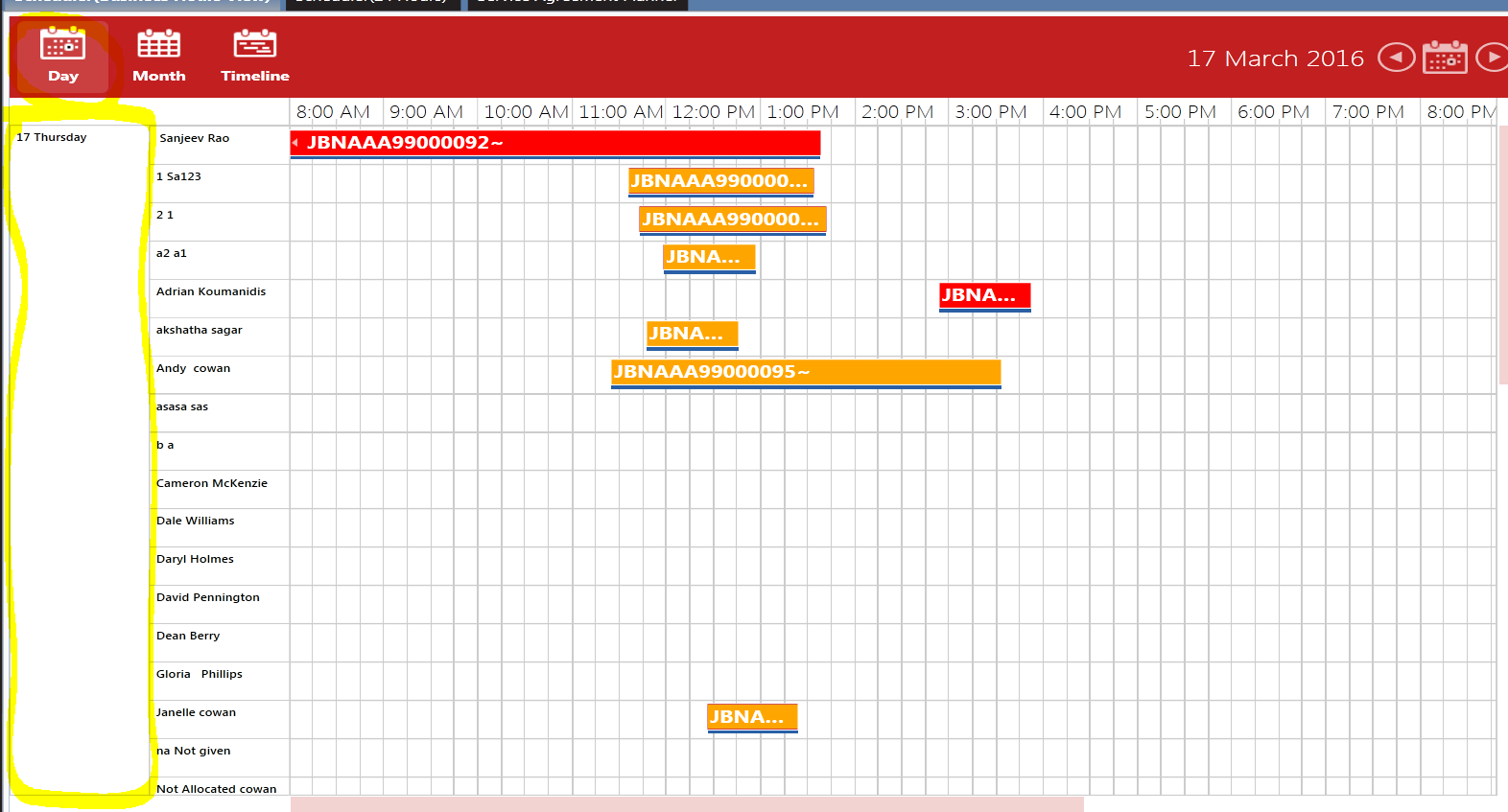 Anyway, what I did was create a custom control that had 7 of the scheduler controls on it all in timeline mode. I then positioned them so that, except for the first one, their headers were under each other. This makes it visually look like a "Calendar Timeline".