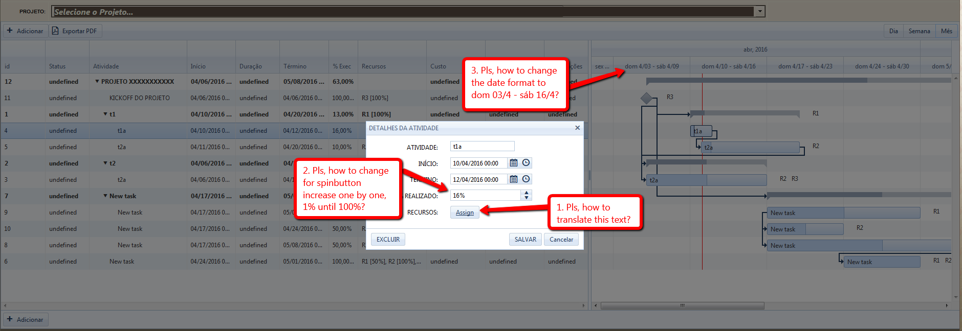 3. In gantt header how to change the date format to "dom 03/4 - sáb 16/4"?