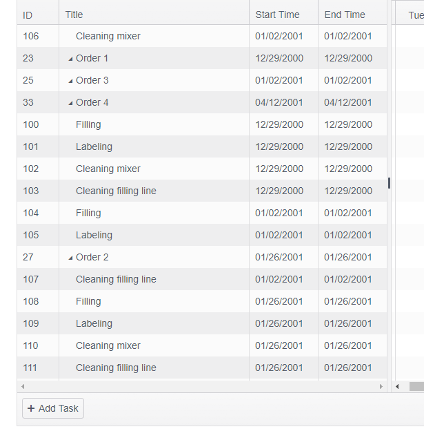 [ { "ID": 23, "orderNo": "200023", "opnNo": null, "parentID": null, "startDate": "/Date(987013800000)/", "finDate": "/Date(987013800000)/", "title": "Order 1", "percentComplete": 0.43, "summary": true, "expanded": true }, { "ID": 27, "orderNo": "200027", "opnNo": null, "parentID": null, "startDate": "/Date(980447400000)/", "finDate": "/Date(980447400000)/", "title": "Order 2", "percentComplete": 0.67, "summary": true, "expanded": true }, { "ID": 25, "orderNo": "200025", "opnNo": null, "parentID": null, "startDate": "/Date(978373800000)/", "finDate": "/Date(978373800000)/", "title": "Order 3", "percentComplete": 0.56, "summary": true, "expanded": true }, { "ID": 33, "orderNo": "200033", "opnNo": null, "parentID": null, "startDate": "/Date(-62135596800000)/", "finDate": "/Date(-62135596800000)/", "title": "Order 4", "percentComplete": 0.89, "summary": true, "expanded": true }, { "ID": 100, "orderNo": "200023", "opnNo": 10, "parentID": 23, "startDate": "/Date(978083400000)/", "finDate": "/Date(978085800000)/", "title": "Filling", "percentComplete": 0.2, "summary": false, "expanded": true }, { "ID": 101, "orderNo": "200023", "opnNo": 20, "parentID": 23, "startDate": "/Date(978083400000)/", "finDate": "/Date(978085800000)/", "title": "Labeling", "percentComplete": 0.2, "summary": false, "expanded": true }, { "ID": 102, "orderNo": "200023", "opnNo": 30, "parentID": 23, "startDate": "/Date(978085800000)/", "finDate": "/Date(978089400000)/", "title": "Cleaning mixer", "percentComplete": 1, "summary": false, "expanded": true }, { "ID": 103, "orderNo": "200023", "opnNo": 40, "parentID": 23, "startDate": "/Date(978085800000)/", "finDate": "/Date(978089400000)/", "title": "Cleaning filling line", "percentComplete": 1, "summary": false, "expanded": true }, { "ID": 104, "orderNo": "200025", "opnNo": 10, "parentID": 25, "startDate": "/Date(978428880000)/", "finDate": "/Date(978431400000)/", "title": "Filling", "percentComplete": 0.2, "summary": false, "expanded": true }, { "ID": 105, "orderNo": "200025", "opnNo": 20, "parentID": 25, "startDate": "/Date(978428880000)/", "finDate": "/Date(978431400000)/", "title": "Labeling", "percentComplete": 0.2, "summary": false, "expanded": true }, { "ID": 106, "orderNo": "200025", "opnNo": 30, "parentID": 25, "startDate": "/Date(978431400000)/", "finDate": "/Date(978435000000)/", "title": "Cleaning mixer", "percentComplete": 1, "summary": false, "expanded": true }, { "ID": 107, "orderNo": "200025", "opnNo": 40, "parentID": 25, "startDate": "/Date(978431400000)/", "finDate": "/Date(978435000000)/", "title": "Cleaning filling line", "percentComplete": 1, "summary": false, "expanded": true }, { "ID": 108, "orderNo": "200027", "opnNo": 10, "parentID": 27, "startDate": "/Date(980502360000)/", "finDate": "/Date(980505000000)/", "title": "Filling", "percentComplete": 0.2, "summary": false, "expanded": true }, { "ID": 109, "orderNo": "200027", "opnNo": 20, "parentID": 27, "startDate": "/Date(980502360000)/", "finDate": "/Date(980505000000)/", "title": "Labeling", "percentComplete": 0.2, "summary": false, "expanded": true }, { "ID": 110, "orderNo": "200027", "opnNo": 30, "parentID": 27, "startDate": "/Date(980505000000)/", "finDate": "/Date(980508600000)/", "title": "Cleaning mixer", "percentComplete": 1, "summary": false, "expanded": true }, { "ID": 111, "orderNo": "200027", "opnNo": 40, "parentID": 27, "startDate": "/Date(980505000000)/", "finDate": "/Date(980508600000)/", "title": "Cleaning filling line", "percentComplete": 1, "summary": false, "expanded": true }, { "ID": 112, "orderNo": "200033", "opnNo": 10, "parentID": 33, "startDate": "/Date(987068520000)/", "finDate": "/Date(987071400000)/", "title": "Filling", "percentComplete": 0.4, "summary": false, "expanded": true }, { "ID": 113, "orderNo": "200033", "opnNo": 20, "parentID": 33, "startDate": "/Date(987069240000)/", "finDate": "/Date(987071400000)/", "title": "Labeling", "percentComplete": 0.2, "summary": false, "expanded": true }, { "ID": 114, "orderNo": "200033", "opnNo": 30, "parentID": 33, "startDate": "/Date(987071400000)/", "finDate": "/Date(987075000000)/", "title": "Cleaning mixer", "percentComplete": 1, "summary": false, "expanded": true }, { "ID": 115, "orderNo": "200033", "opnNo": 40, "parentID": 33, "startDate": "/Date(987071400000)/", "finDate": "/Date(987075000000)/", "title": "Cleaning filling line", "percentComplete": 1, "summary": false, "expanded": true }]
