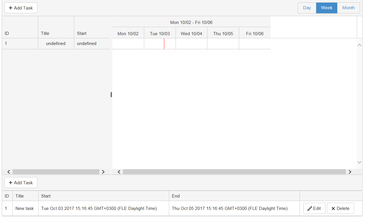 public List<GanttTask> Read() { return new List<GanttTask>() { new GanttTask() { ID= 1, Title = "New task", Name= "New Task", Start = DateTime.Now, End=DateTime.Now.AddDays(2), OrderId = 1, ParentID = null } }; }
