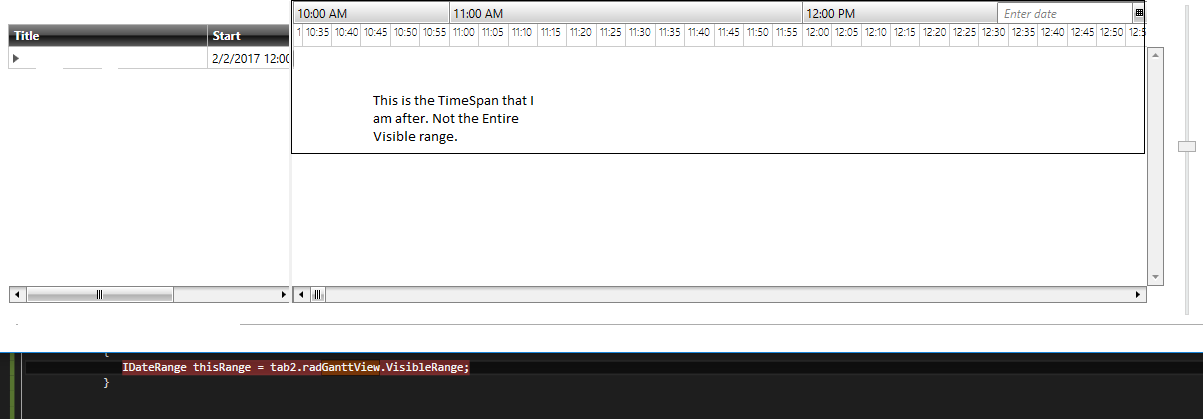 I am trying to get a the timespan the user can "see", not scroll through. For instance, if the ganttview covers from 1/3/2015 12:45AM to 4/11/2025 however the graph is zoomed (using PixelLength) such that only a window from, say, 2/2/2017 7:45PM to 2/2/2017 9:56PM is visible. I want to be able to get the timespan associated with 2/2/2017 7:45PM to 2/2/2017 9:56PM not the entire visible range.
