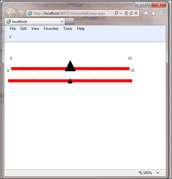 <%@ Page Language="C#" AutoEventWireup="true" CodeBehind="HorizontalLinear.aspx.cs" Inherits="RadControlsWebApp1.HorizontalLinear" %><!DOCTYPE html PUBLIC "-//W3C//DTD XHTML 1.0 Transitional//EN" "http://www.w3.org/TR/xhtml1/DTD/xhtml1-transitional.dtd"><html xmlns="http://www.w3.org/1999/xhtml"><head runat="server"> <title></title></head><body> <form id="form1" runat="server"> <telerik:RadStyleSheetManager ID="RadStyleSheetManager1" runat="server" /> <telerik:RadAjaxManager ID="RadAjaxManager1" runat="server" /> <telerik:RadScriptManager ID="RadScriptManager1" runat="server"> <Scripts> <asp:ScriptReference Assembly="Telerik.Web.UI" Name="Telerik.Web.UI.Common.Core.js" /> <asp:ScriptReference Assembly="Telerik.Web.UI" Name="Telerik.Web.UI.Common.jQuery.js" /> <asp:ScriptReference Assembly="Telerik.Web.UI" Name="Telerik.Web.UI.Common.jQueryInclude.js"/> </Scripts> </telerik:RadScriptManager> <div style="position: relative"> <div style="position: absolute; top: 0px; left: 0px"> <telerik:RadLinearGauge ID="RadLinearGauge1" runat="server" Transitions="True" Width="432" Height="140"> <Pointer Value="25" Shape="BarIndicator" Size="28"></Pointer> <Scale Min="0" Max="10" Vertical="False" Mirror="True"> <Ranges> <telerik:GaugeRange From="0" To="20" Color="red" /> <telerik:GaugeRange From="20" To="40" Color="blue" /> <telerik:GaugeRange From="40" To="60" Color="green" /> </Ranges> </Scale> </telerik:RadLinearGauge> </div> <div style="position: absolute; top: 2px; left: 0px"> <telerik:RadLinearGauge ID="RadLinearGauge2" runat="server" Transitions="True" Width="432" Height="140"> <Pointer Value="25" Shape="Arrow" Color="Black"></Pointer> <Scale Min="0" Max="10" Vertical="False" Mirror="True" MinorTicks-Size="35" MajorTicks-Size="42"> <Ranges> <telerik:GaugeRange From="0" To="20" Color="red" /> <telerik:GaugeRange From="20" To="40" Color="blue" /> <telerik:GaugeRange From="40" To="60" Color="green" /> </Ranges> </Scale> </telerik:RadLinearGauge> </div></div> </form></body></html>Note that when you change: