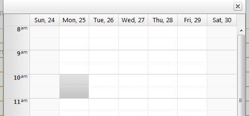 <telerik:RadScheduler ID="replenishmentSchedule" runat="server" SelectedView="WeekView" ShowHeader="false" ShowFooter="false" DayStartTime="08:00:00" DayEndTime="17:00:00" OnDataBinding="replenishmentSchedule_DataBinding" ShowAllDayRow="false"> <TimelineView ColumnHeaderDateFormat="dddd" /></telerik:RadScheduler>0