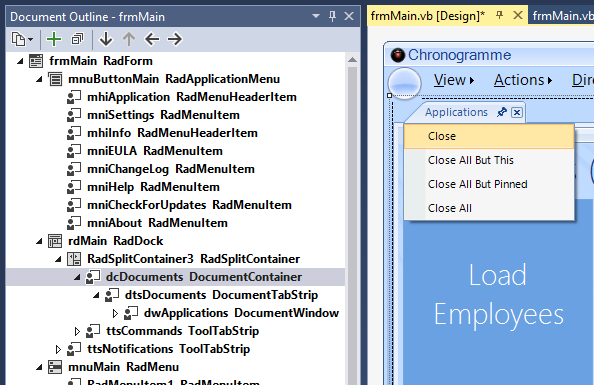 So I have a form with a RadDock control which has a DocumentContainer which has a DocumentTabStrip on which I had created 4 DocumentsWindows