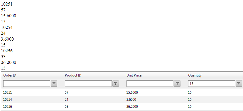 <telerik:RadGrid ID="RadGrid1" runat="server" AutoGenerateColumns="false" DataSourceID="SqlDataSource2" GridLines="None" AllowPaging="true" AllowFilteringByColumn="true" ondatabound="RadGrid1_DataBound1" onitemcommand="RadGrid1_ItemCommand"> <MasterTableView> <Columns> <telerik:GridBoundColumn UniqueName="OrderID" DataField="OrderID" HeaderText="OrderID" /> <telerik:GridBoundColumn DataField="ShipCity" HeaderText="ShipCity" /> <telerik:GridBoundColumn DataField="CustomerID" HeaderText="CustomerID" /> </Columns> </MasterTableView></telerik:RadGrid>C#: