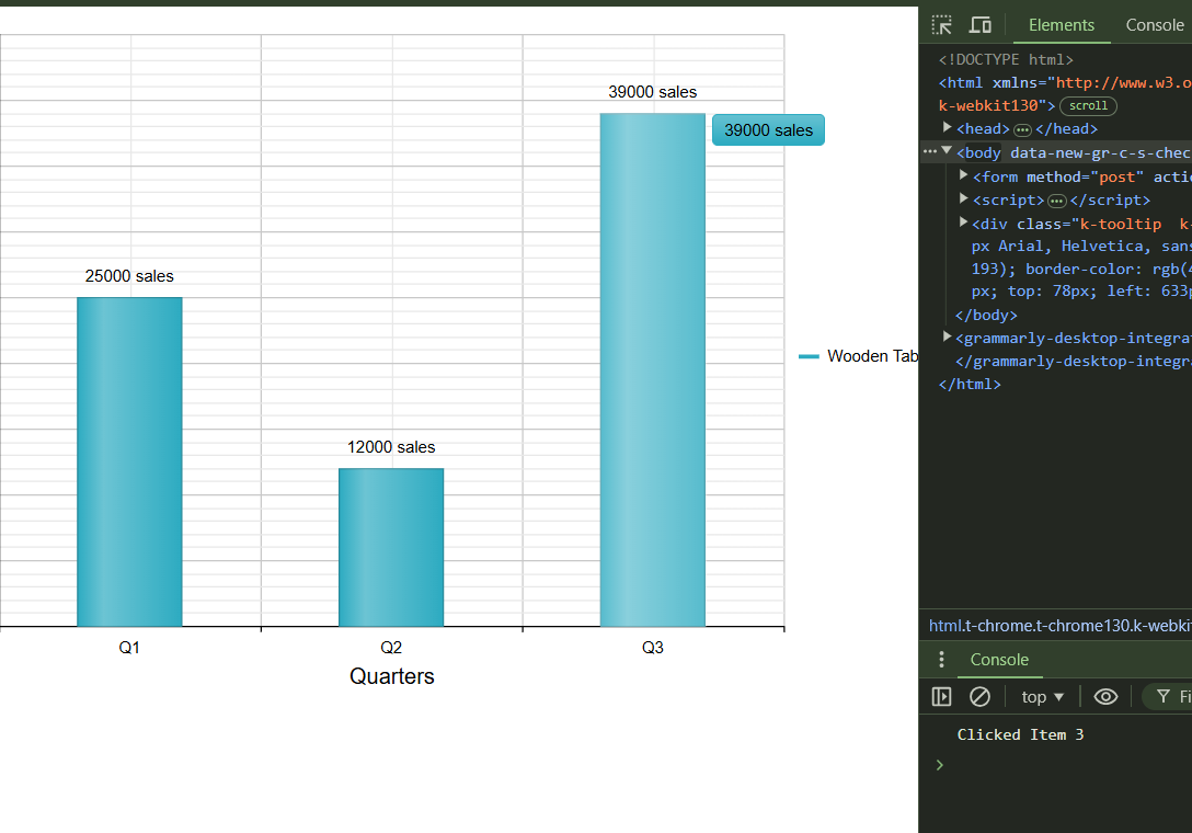 <telerik:RadHtmlChart runat="server" ID="ColumnChart" Width="800" Height="500" Transitions="true" Skin="Silk"> <PlotArea> <Series> <telerik:ColumnSeries Name="Wooden Table" Stacked="false" Gap="1.5" Spacing="0.4"> <LabelsAppearance DataFormatString="{0} sales" Position="OutsideEnd"></LabelsAppearance> <TooltipsAppearance DataFormatString="{0} sales" Color="White"></TooltipsAppearance> <SeriesItems> <telerik:CategorySeriesItem Y="25000"></telerik:CategorySeriesItem> <telerik:CategorySeriesItem Y="12000"></telerik:CategorySeriesItem> <telerik:CategorySeriesItem Y="39000"></telerik:CategorySeriesItem> </SeriesItems> </telerik:ColumnSeries> </Series> <XAxis AxisCrossingValue="0" Color="black"> <Items> <telerik:AxisItem LabelText="1"></telerik:AxisItem> <telerik:AxisItem LabelText="2"></telerik:AxisItem> <telerik:AxisItem LabelText="3"></telerik:AxisItem> </Items> <LabelsAppearance DataFormatString="Q{0}" RotationAngle="0" Skip="0" Step="1" /> <TitleAppearance Position="Center" RotationAngle="0" Text="Quarters" /> </XAxis> <YAxis AxisCrossingValue="0" Color="black" MajorTickSize="1" MajorTickType="Outside" MinorTickType="None" Reversed="false"> <LabelsAppearance DataFormatString="{0} sales" RotationAngle="0" Skip="0" Step="1" /> <TitleAppearance Position="Center" RotationAngle="0" Text="Sales" /> </YAxis> </PlotArea> <ClientEvents OnSeriesClick="onSeriesClick" /> </telerik:RadHtmlChart>