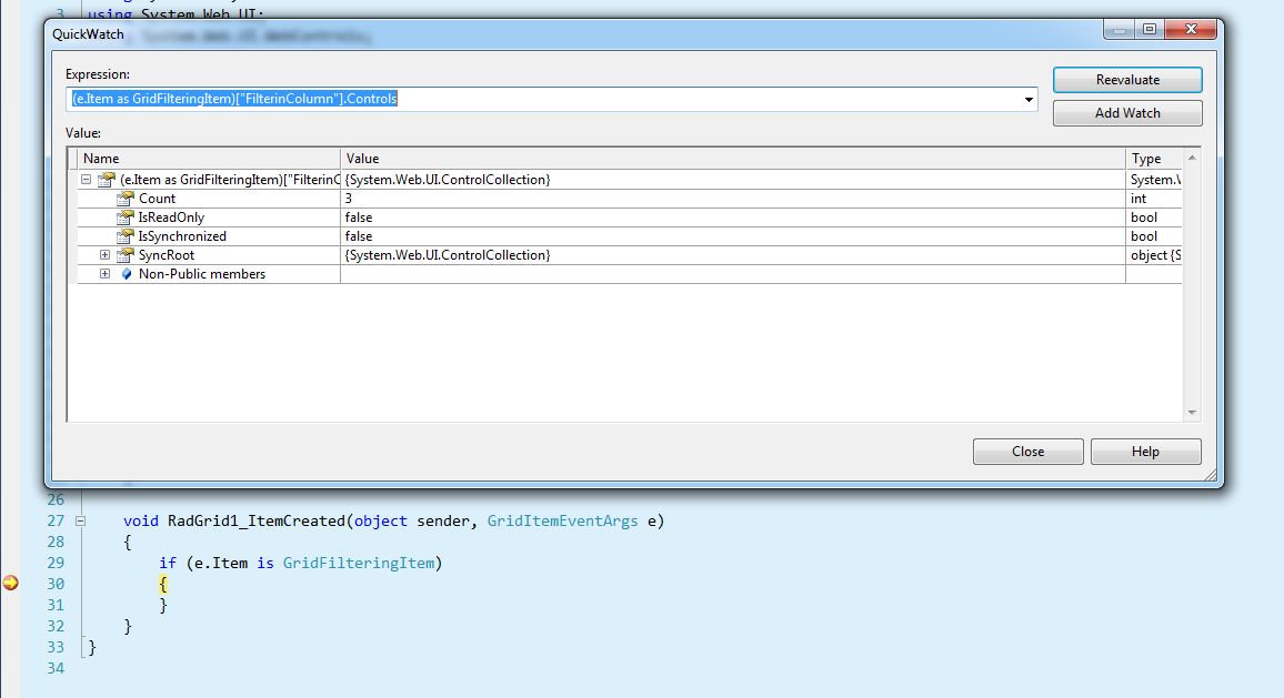 You can easily examine the Controls collection by using the Quick Watch dialog box in Visual Studio by checking first the length of the collection and if it is larger than 0 - checking each index separately. You can read more on Quick Watch at that address. Additionally, I attach a screenshot demonstrating how I inspected the filtering item.