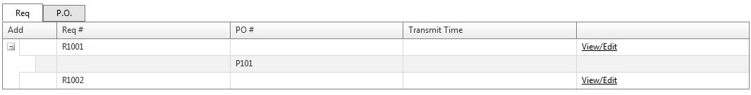 <telerik:RadAjaxLoadingPanel ID="replenishmentLoadingPanel" runat="server" Skin="Simple" /> <telerik:RadTabStrip ID="replenishmentTabStrip" runat="server" Skin="Simple" MultiPageID="RadMultiPage2" SelectedIndex="0"> <Tabs> <telerik:RadTab Text="Req"> </telerik:RadTab> <telerik:RadTab Text="P.O."> </telerik:RadTab> </Tabs> </telerik:RadTabStrip> <telerik:RadMultiPage ID="RadMultiPage2" runat="server" SelectedIndex="0" > <telerik:RadPageView ID="replenishmentPageView1" runat="server"> <telerik:RadTreeList ID="requisitionTreeList" runat="server" AutoGenerateColumns="false" AllowSorting="false" AllowPaging="false" OnNeedDataSource="requistions_needdata" OnPreRender="replenishment_PreRender" OnItemCreated="requisitons_ItemCreated" DataKeyNames="ID" ParentDataKeyNames="PID" ShowTreeLines="false" EditMode="PopUp" > <Columns> <telerik:TreeListEditCommandColumn ShowEditButton="false" AddRecordText="Add" HeaderStyle-Width="30px" /> <telerik:TreeListBoundColumn DataField="ID" Visible="false" /> <telerik:TreeListBoundColumn DataField="PID" Visible="false" /> <telerik:TreeListBoundColumn DataField="ReqNum" HeaderText="Req #" UniqueName="ReqNum" /> <telerik:TreeListBoundColumn DataField="PONumber" HeaderText="PO #" /> <telerik:TreeListBoundColumn DataField="ReqDateTime" HeaderText="Transmit Time" /> <telerik:TreeListTemplateColumn UniqueName="TemplateEditColumn"> <ItemTemplate> <asp:HyperLink ID="EditLink" runat="server" Text="View/Edit" href="#" onclick="openRadWin();"></asp:HyperLink> </ItemTemplate> </telerik:TreeListTemplateColumn> </Columns> </telerik:RadTreeList> </telerik:RadPageView> <telerik:RadPageView ID="repenishmentPageView2" runat="server"> <telerik:RadTreeList ID="purchaseorderTreeList" runat="server" AutoGenerateColumns="false" AllowSorting="false" AllowPaging="false" OnNeedDataSource="purchaseOrders_needdata" DataKeyNames="ID" ParentDataKeyNames="PID" ShowTreeLines="false" EditMode="PopUp" > <Columns> <telerik:TreeListEditCommandColumn ShowEditButton="false" AddRecordText="Add" HeaderStyle-Width="50px" /> <telerik:TreeListBoundColumn DataField="ID" Visible="false" /> <telerik:TreeListBoundColumn DataField="PID" Visible="false" /> <telerik:TreeListBoundColumn DataField="PONumber" HeaderText="PO #" /> <telerik:TreeListBoundColumn DataField="ReqNum" HeaderText="Req #" /> <telerik:TreeListBoundColumn DataField="PODateTime" HeaderText="Transmit Time" /> </Columns> </telerik:RadTreeList> </telerik:RadPageView> </telerik:RadMultiPage>C#