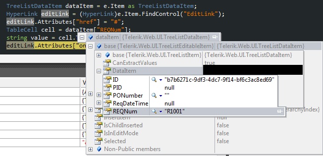 I am trying to set the attributes of an edit hyperlink in a TreeList. When you click the edit hyperlink it will execute javascript to open a RadWindow. What I would like to do is to pass the "Req #" column value when you click the hyperlink. I thought the best way would be to write that value in the onclick attribute on each hyperlink created. Although I'm having trouble getting the associated "Req #" column value.