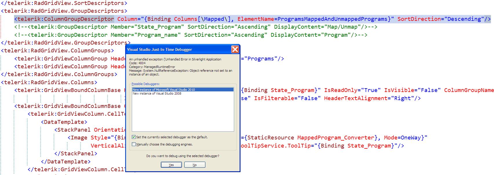 <Window x:Class="DataGridLoadingTest.MainWindow" xmlns:telerik="http://schemas.telerik.com/2008/xaml/presentation" xmlns:local="clr-namespace:DataGridLoadingTest" xmlns:s="clr-namespace:System;assembly=mscorlib" xmlns:telerikData="clr-namespace:Telerik.Windows.Data;assembly=Telerik.Windows.Data" Title="MainWindow" Height="350" Width="600"> <Window.Resources> <!--<src:BoolToVisiblityConverter x:Key="bool2vis"/>--> </Window.Resources> <Grid> <Grid.RowDefinitions> <RowDefinition Height="20"/> <RowDefinition Height="*"/> </Grid.RowDefinitions> <Button Grid.Row="0" Content="LoadData" Click="LaodData_Click" HorizontalAlignment="Right"/> <telerik:RadGridView x:Name="telrikDataGrid" Grid.Row="1" ShowColumnFooters="True" ShowGroupFooters="True" AlternateRowBackground="Azure" AlternationCount="2" AutoGenerateColumns="False" IsReadOnly="True"> <telerik:RadGridView.Columns> <telerik:GridViewDataColumn Header="ID" DataMemberBinding="{Binding PresentationID}"> <telerik:GridViewDataColumn.AggregateFunctions> <telerik:CountFunction Caption="Total Rows"/> </telerik:GridViewDataColumn.AggregateFunctions> </telerik:GridViewDataColumn> <telerik:GridViewDataColumn Header="PresentationPath" DataMemberBinding="{Binding PresentationPath}" > </telerik:GridViewDataColumn> <telerik:GridViewDataColumn Header="PresentationName" DataMemberBinding="{Binding PresentationName}" > </telerik:GridViewDataColumn> <telerik:GridViewDataColumn Header="StratTime" DataMemberBinding="{Binding StartTime}"> </telerik:GridViewDataColumn> <telerik:GridViewDataColumn Header="EndTime" DataMemberBinding="{Binding EndTime}"> </telerik:GridViewDataColumn> <telerik:GridViewDataColumn Header="Duration(Sec)" DataMemberBinding="{Binding Duration}"> <telerik:GridViewDataColumn.AggregateFunctions> <telerik:SumFunction SourceFieldType="{x:Type s:Int64}" ResultFormatString="{}{0:d}" Caption="Total Duration: " SourceField="Duration"/> </telerik:GridViewDataColumn.AggregateFunctions> </telerik:GridViewDataColumn> <telerik:GridViewDataColumn Header="LogLevel" DataMemberBinding="{Binding LogLevel}"> </telerik:GridViewDataColumn> <telerik:GridViewDataColumn Header="Mode" DataMemberBinding="{Binding Mode}"> </telerik:GridViewDataColumn> </telerik:RadGridView.Columns> <telerik:RadGridView.GroupDescriptors> <telerik:ColumnGroupDescriptor Column="{Binding Columns[\PresentationName\], ElementName=telrikDataGrid}" SortDirection="Ascending" /> </telerik:RadGridView.GroupDescriptors> </telerik:RadGridView> </Grid></Window><Window x:Class="DataGridLoadingTest.MainWindow" xmlns:telerik="http://schemas.telerik.com/2008/xaml/presentation" xmlns:local="clr-namespace:DataGridLoadingTest" xmlns:s="clr-namespace:System;assembly=mscorlib" xmlns:telerikData="clr-namespace:Telerik.Windows.Data;assembly=Telerik.Windows.Data" Title="MainWindow" Height="350" Width="600"> <Window.Resources> <!--<src:BoolToVisiblityConverter x:Key="bool2vis"/>--> </Window.Resources> <Grid> <Grid.RowDefinitions> <RowDefinition Height="20"/> <RowDefinition Height="*"/> </Grid.RowDefinitions> <Button Grid.Row="0" Content="LoadData" Click="LaodData_Click" HorizontalAlignment="Right"/> <telerik:RadGridView x:Name="telrikDataGrid" Grid.Row="1" ShowColumnFooters="True" ShowGroupFooters="True" AlternateRowBackground="Azure" AlternationCount="2" AutoGenerateColumns="False" IsReadOnly="True"> <telerik:RadGridView.Columns> <telerik:GridViewDataColumn Header="ID" DataMemberBinding="{Binding PresentationID}"> <telerik:GridViewDataColumn.AggregateFunctions> <telerik:CountFunction Caption="Total Rows"/> </telerik:GridViewDataColumn.AggregateFunctions> </telerik:GridViewDataColumn> <telerik:GridViewDataColumn Header="PresentationPath" DataMemberBinding="{Binding PresentationPath}" > </telerik:GridViewDataColumn> <telerik:GridViewDataColumn Header="PresentationName" DataMemberBinding="{Binding PresentationName}" > </telerik:GridViewDataColumn> <telerik:GridViewDataColumn Header="StratTime" DataMemberBinding="{Binding StartTime}"> </telerik:GridViewDataColumn> <telerik:GridViewDataColumn Header="EndTime" DataMemberBinding="{Binding EndTime}"> </telerik:GridViewDataColumn> <telerik:GridViewDataColumn Header="Duration(Sec)" DataMemberBinding="{Binding Duration}"> <telerik:GridViewDataColumn.AggregateFunctions> <telerik:SumFunction SourceFieldType="{x:Type s:Int64}" ResultFormatString="{}{0:d}" Caption="Total Duration: " SourceField="Duration"/> </telerik:GridViewDataColumn.AggregateFunctions> </telerik:GridViewDataColumn> <telerik:GridViewDataColumn Header="LogLevel" DataMemberBinding="{Binding LogLevel}"> </telerik:GridViewDataColumn> <telerik:GridViewDataColumn Header="Mode" DataMemberBinding="{Binding Mode}"> </telerik:GridViewDataColumn> </telerik:RadGridView.Columns> <telerik:RadGridView.GroupDescriptors> <!--Here i am getting an error..i mean in the given line as " Object reference not set to an instance of an object. "--> <telerik:ColumnGroupDescriptor Column="{Binding Columns[\PresentationName\], ElementName=telrikDataGrid}" SortDirection="Ascending" /> </telerik:RadGridView.GroupDescriptors> </telerik:RadGridView> </Grid></Window> <telerik:GridViewDataColumn Header="EndTime" DataMemberBinding="{Binding EndTime}"> </telerik:GridViewDataColumn> <telerik:GridViewDataColumn Header="Duration(Sec)" DataMemberBinding="{Binding Duration}"> <telerik:GridViewDataColumn.AggregateFunctions> <telerik:SumFunction SourceFieldType="{x:Type s:Int64}" ResultFormatString="{}{0:d}" Caption="Total Duration: " SourceField="Duration"/> </telerik:GridViewDataColumn.AggregateFunctions> </telerik:GridViewDataColumn> <telerik:GridViewDataColumn Header="LogLevel" DataMemberBinding="{Binding LogLevel}"> </telerik:GridViewDataColumn> <telerik:GridViewDataColumn Header="Mode" DataMemberBinding="{Binding Mode}"> </telerik:GridViewDataColumn> </telerik:RadGridView.Columns> <telerik:RadGridView.GroupDescriptors> <telerik:ColumnGroupDescriptor Column="{Binding Columns[\PresentationName\], ElementName=telrikDataGrid}" SortDirection="Asce