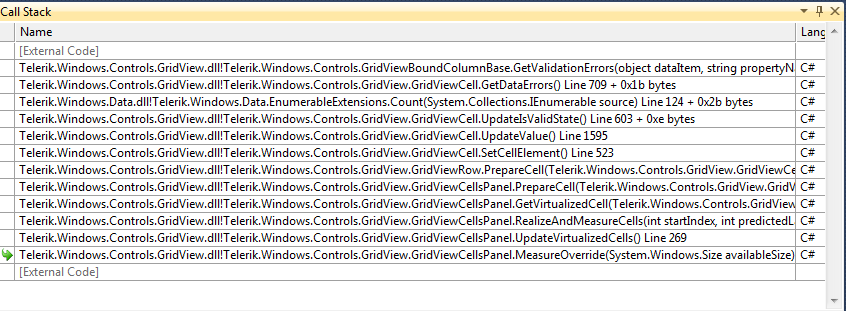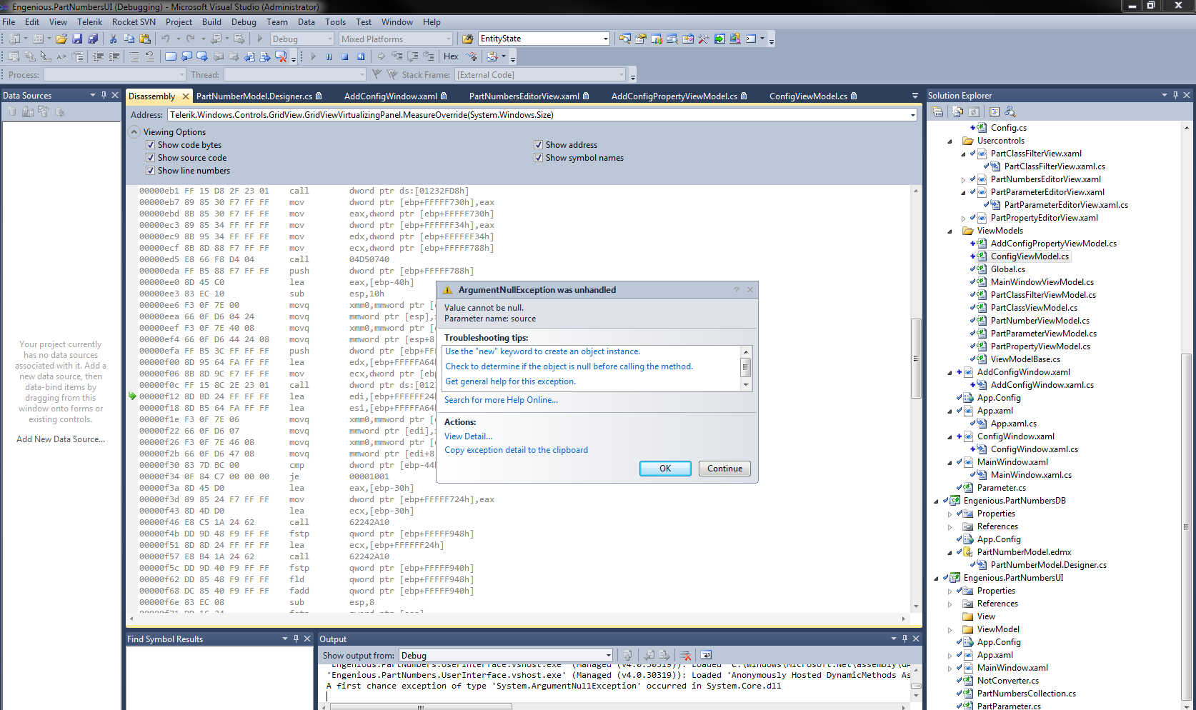 I am using Radgridview in my WPF app. The view model implements Idataerrorinfo interface. Whenever I add a new row to the radGridview I get that exception from a file called Disassembly. Any idea what might cause this error.