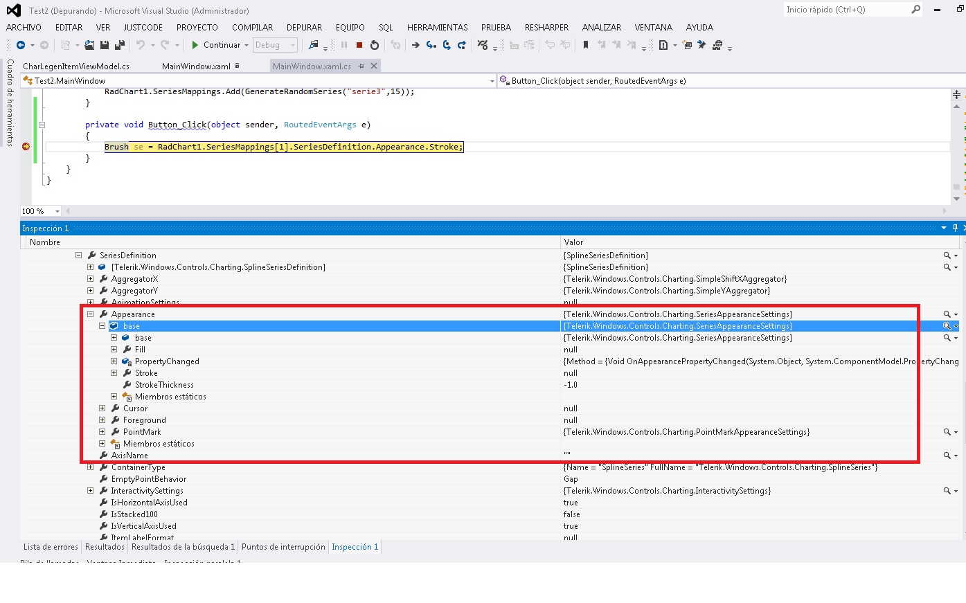 <telerik:RadChart x:Name="RadChart1" Grid.Row="1" Grid.Column="1" UseDefaultLayout="False"> <telerik:RadChart.SamplingSettings> <telerik:SamplingSettings SamplingFunction="Average" /> </telerik:RadChart.SamplingSettings> <Grid> <Grid.ColumnDefinitions> <ColumnDefinition Width="10" /> <ColumnDefinition Width="*" /> <ColumnDefinition Width="10" /> </Grid.ColumnDefinitions> <Grid.RowDefinitions> <RowDefinition Height="10" /> <RowDefinition Height="*" /> <RowDefinition Height="100" /> <RowDefinition Height="10" /> </Grid.RowDefinitions> <Grid /> <telerik:ChartLegend x:Name="legendChart" Grid.Row="2" Grid.Column="1" Header="" ItemContainerStyle="{DynamicResource CharLegendStyle}" ItemsPanelOrientation="Horizontal" LegendItemMarkerShape="Circle" UseAutoGeneratedItems="false" /> <telerik:ChartArea x:Name="lineGraphChartArea" Grid.Row="1" Grid.Column="1" HorizontalAlignment="Stretch" VerticalAlignment="Stretch" EnableAnimations="False" LegendName="legendChart"> <telerik:ChartArea.AxisX> <telerik:AxisX Title="Fecha" AutoRange="True" IsDateTime="True" Step="1" /> </telerik:ChartArea.AxisX> <telerik:ChartArea.AxisY> <telerik:AxisY Title="CMN" AutoRange="True" ExtendDirection="Up" IsZeroBased="True" /> </telerik:ChartArea.AxisY> </telerik:ChartArea> </Grid></telerik:RadChart>public SeriesMapping GenerateRandomSeries(string nameSerie,int begin) { SeriesMapping serie1 = new SeriesMapping(); serie1.ItemsSource = GenerateRandomData(begin); serie1.ChartAreaName = "lineGraphChartArea"; serie1.LegendLabel = nameSerie; ItemMapping X = new ItemMapping("Fecha", DataPointMember.XValue); ItemMapping Y = new ItemMapping("CMN", DataPointMember.YValue); serie1.ItemMappings.Add(X); serie1.ItemMappings.Add(Y); serie1.SeriesDefinition = new SplineSeriesDefinition() { }; return serie1; }public void AddSerieDefinition() { RadChart1.SeriesMappings.Add(GenerateRandomSeries("serie1",5)); RadChart1.SeriesMappings.Add(GenerateRandomSeries("serie2",10)); RadChart1.SeriesMappings.Add(GenerateRandomSeries("serie3",15)); }I try get color and (look attached)