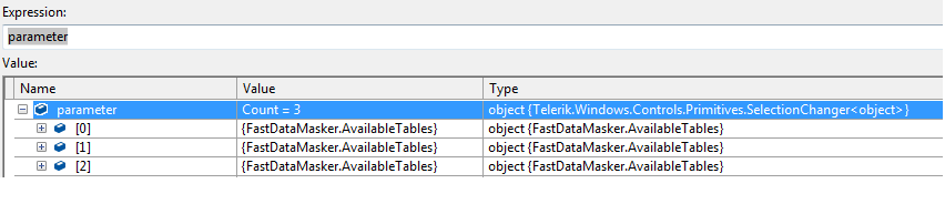 Now, I can see the type of my parameter is Telerik.Windows.Controls.Primitives.SelectionChanger<object>, but I am not able to cast it in codebehind as I cannot see Telerik.Windows.Controls.Primitives.SelectionChanger.