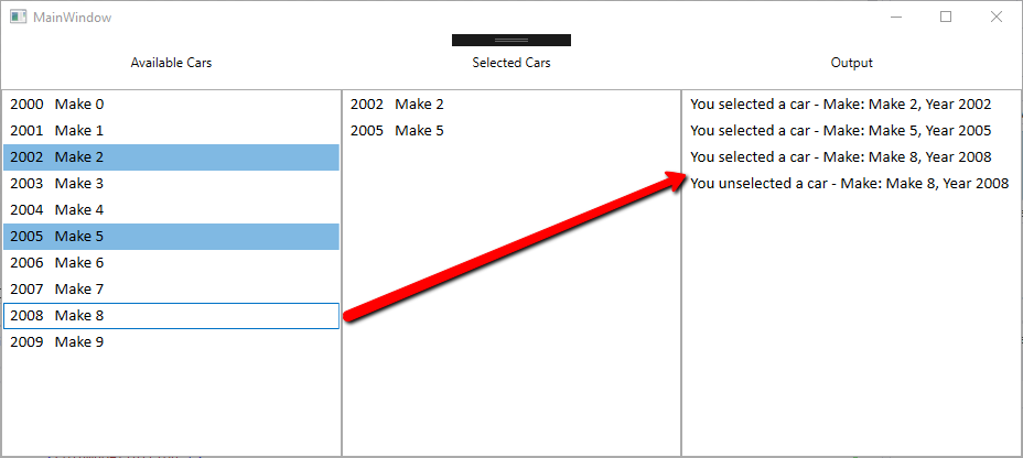 /// <summary>/// This is where you can detect what was selected or deselected in the RadListBox/// because the ObservableCollection is two-way bound to the SelectedItemsSource property/// </summary>private void SelectedCars_CollectionChanged(object sender, System.Collections.Specialized.NotifyCollectionChangedEventArgs e){ if (e.NewItems != null && e.NewItems.Count > 0) { var addedCar = e.NewItems[0] as Car; Output.Add($"You selected a car - Make: {addedCar?.Make}, Year {addedCar?.Year}"); } if (e.OldItems != null && e.OldItems.Count > 0) { var removedCar = e.OldItems[0] as Car; Output.Add($"You unselected a car - Make: {removedCar?.Make}, Year {removedCar?.Year}"); }}If you're still having trouble, please change the attached demo to replicate the problem. Then open a support ticket, attach the repro project and we'll investigate further.