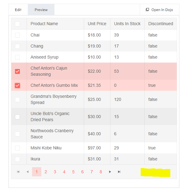 Based on the code in yellow, the text inside our custom element is changed. The code in green uses the select method of the Grid to get the currently selected rows.