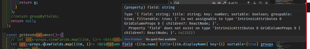 //let cols=props.viewFields.map((itm, i)=> <GridColumn field ={itm.name} title={itm.displayName} key={i} sortable={true} groupable={true} filterable={true} /> )