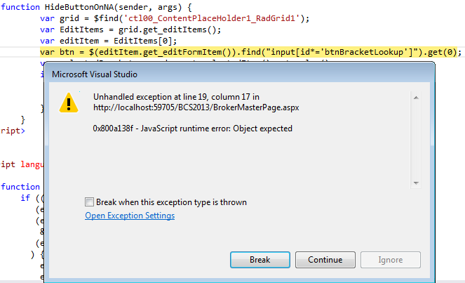 function HideButtonOnNA(sender, args) { var grid = $find("<%= RadGrid1.ClientID %>"); if (grid) { var MasterTable = grid.get_masterTableView(); var editIndex = $find("<%=RadGrid1.ClientID %>")._editIndexes; var Rows = MasterTable.get_dataItems(); var btn = $(Rows[editIndex].get_element()).find("span[id*='btnBracketLookup']").get(0); // errors out, object not defined //var btn = $telerik.findControl(Rows[editIndex].get_element(), "btnBracketLookup"); //returns null //var btn = Rows[editIndex].findControl("btnBracketLookup"); // returns null alert(btn); //var selectedBracket = sender.get_selectedItem().get_value(); //if (selectedBracket == -1) { // btn.set_visible(false); // alert(btn.get_visible()); //} }}0