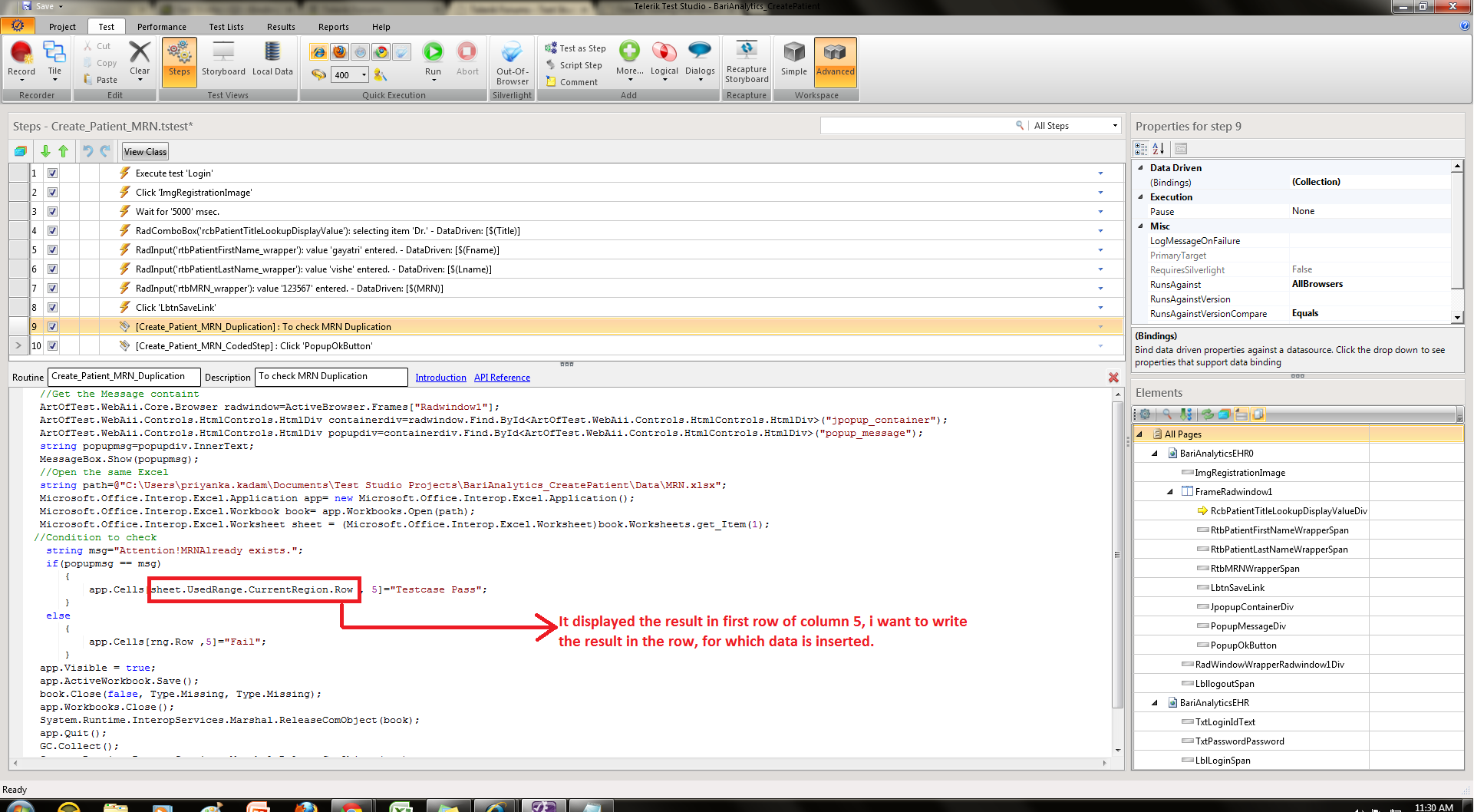 For that i have created the coded step, in which i am checking the condition and based on the Condition Pass/Fail should be write for same row.But i am not getting the currently selected rowindex from excel.