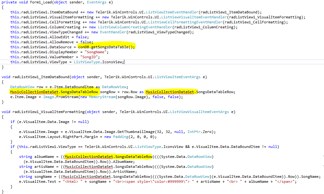 But instead of using a fixed DataTable, I'm connecting to a database. As I return a DataTable, everything was going ok until I found the word "MusicCollectionDataSet.SongsDataTableRow" and for example the line MusicCollectionDataSet.SongsDataTableRow songRow = row.Row as MusicCollectionDataSet.SongsDataTableRow; but as I have changed the DataSource to a DataTable from the Database, I don't know what is the script to replace those lines.