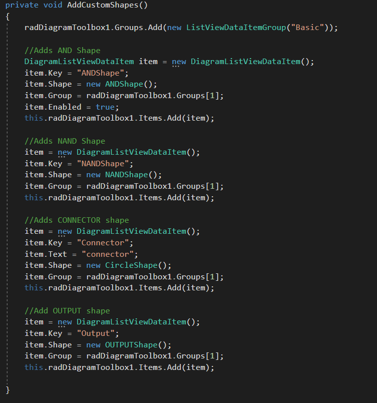 I have made classes for custom shapes that i have added to my toolbox. All these classes are derived from ElementShape. My problem however is that i would like to get the type of each shape as the way i created them with my own separate classes. Once these custom shapes are dragged from the toolbox and dropped onto the diagram, they are identified as RadDiagramShape. This is a problem because i need to identify of which type each shape is, as the way that i have declared them. For example i have declared a class with an Input shape, and a class with an Output shape. I need to know from the diagram, which shape is of what type, for example is it an input shape or is it an output shape. Because my current code only tells me that it is a RadDiagramShape. This does not allow me to know whether it is an input or an output. I have attached screenshot of the problem and of my code.
