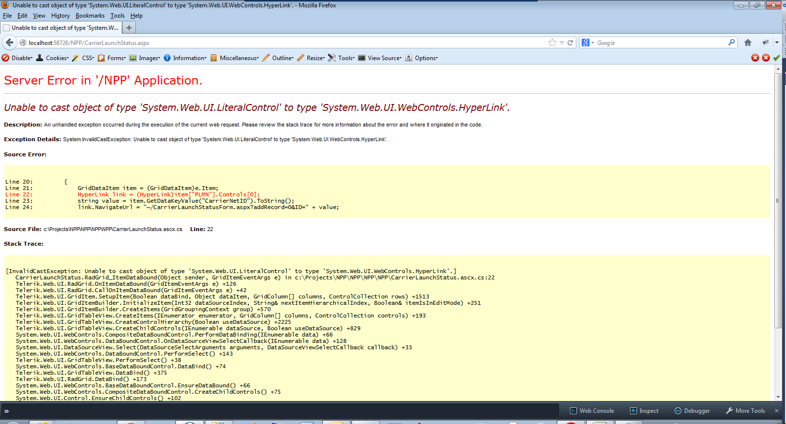 <telerik:RadGrid ID="RadGrid1" DataSourceID="SqlDataSource1" ShowStatusBar="true" runat="server" AllowPaging="True" AllowSorting="True" AllowFilteringByColumn="True" AutoGenerateColumns="false" ClientSettings-Resizing-AllowColumnResize="true" DataKeyNames="CarrierNetID" OnItemDataBound="RadGrid_ItemDataBound"> <MasterTableView PageSize="10" Width="100%"> <Columns> <telerik:GridBoundColumn DataField="CarrierNetID" Visible="false" UniqueName="CarrierNetID" ItemStyle-HorizontalAlign="Left" HeaderStyle-HorizontalAlign="Left"> </telerik:GridBoundColumn> <telerik:GridBoundColumn DataField="Name" HeaderText="Carrier Name" UniqueName="Name" SortExpression="Name" ReadOnly="true" ItemStyle-HorizontalAlign="Left" HeaderStyle-HorizontalAlign="Left"> </telerik:GridBoundColumn> <telerik:GridBoundColumn DataField="Region" HeaderText="Region" UniqueName="Region" AllowFiltering="true" SortExpression="Region" ReadOnly="true" ItemStyle-HorizontalAlign="Left" HeaderStyle-HorizontalAlign="Left"> </telerik:GridBoundColumn> <telerik:GridBoundColumn DataField="Country" HeaderText="Country" UniqueName="Country" SortExpression="Country" ReadOnly="true" ItemStyle-HorizontalAlign="Left" HeaderStyle-HorizontalAlign="Left"> </telerik:GridBoundColumn> <telerik:GridTemplateColumn HeaderText="PLMN" UniqueName="PLMN"> <ItemTemplate> <asp:HyperLink ID="lnkPLMN" runat="server" Target="_blank" ForeColor="Blue"> </asp:HyperLink> </ItemTemplate> </telerik:GridTemplateColumn> <telerik:GridBoundColumn DataField="TechnologyTypeCode" HeaderText="Technology" UniqueName="TechnologyTypeCode" SortExpression="TechnologyTypeCode" ReadOnly="true" ItemStyle-HorizontalAlign="Left" HeaderStyle-HorizontalAlign="Left"> </telerik:GridBoundColumn> <telerik:GridBoundColumn DataField="SMSMORate" HeaderText="SSMSO Rate" UniqueName="SMSMORate" AllowFiltering="false" SortExpression="SMSMORate" ReadOnly="true" ItemStyle-HorizontalAlign="Right" HeaderStyle-HorizontalAlign="Right" DataFormatString="{0:G}"> </telerik:GridBoundColumn> <telerik:GridBoundColumn DataField="SMSMTRate" HeaderText="SMSMT Rate" UniqueName="SMSMTRate" AllowFiltering="false" SortExpression="SMSMTRate" ReadOnly="true" ItemStyle-HorizontalAlign="Right" HeaderStyle-HorizontalAlign="Right" DataFormatString="{0:G}"> </telerik:GridBoundColumn> <telerik:GridBoundColumn DataField="DataRate" HeaderText="Data Rate" UniqueName="DataRate" AllowFiltering="false" SortExpression="DataRate" ReadOnly="true" ItemStyle-HorizontalAlign="Right" HeaderStyle-HorizontalAlign="Right" DataFormatString="{0:G}"> </telerik:GridBoundColumn> <telerik:GridBoundColumn DataField="MOCRate" HeaderText="MOC Rate" UniqueName="MOCRate" AllowFiltering="false" SortExpression="MOCRate" ReadOnly="true" ItemStyle-HorizontalAlign="Right" HeaderStyle-HorizontalAlign="Right" DataFormatString="{0:G}"> </telerik:GridBoundColumn> <telerik:GridBoundColumn DataField="MTCRate" HeaderText="MTC Rate" UniqueName="MTCRate" AllowFiltering="false" SortExpression="MTCRate" ReadOnly="true" ItemStyle-HorizontalAlign="Right" HeaderStyle-HorizontalAlign="Right" DataFormatString="{0:G}"> </telerik:GridBoundColumn> <telerik:GridCheckBoxColumn DataField="FlatRate" HeaderText="Flat Rate" UniqueName="FlatRate" SortExpression="FlatRate" ReadOnly="true" ItemStyle-HorizontalAlign="Center" HeaderStyle-HorizontalAlign="Center"> </telerik:GridCheckBoxColumn> <telerik:GridCheckBoxColumn DataField="Discount" HeaderText="Discount" UniqueName="Discount" SortExpression="Discount" ReadOnly="true" ItemStyle-HorizontalAlign="Center" HeaderStyle-HorizontalAlign="Center"> </telerik:GridCheckBoxColumn> <telerik:GridCheckBoxColumn DataField="ActiveFlag" HeaderText="Active" UniqueName="ActiveFlag" SortExpression="ActiveFlag" ReadOnly="true" ItemStyle-HorizontalAlign="Center" HeaderStyle-HorizontalAlign="Center"> </telerik:GridCheckBoxColumn> </Columns> </MasterTableView> <ClientSettings EnableRowHoverStyle="true"> </ClientSettings> <PagerStyle Mode="NumericPages"></PagerStyle> </telerik:RadGrid>Here is my codebehind which gets the attached error on the following line:
