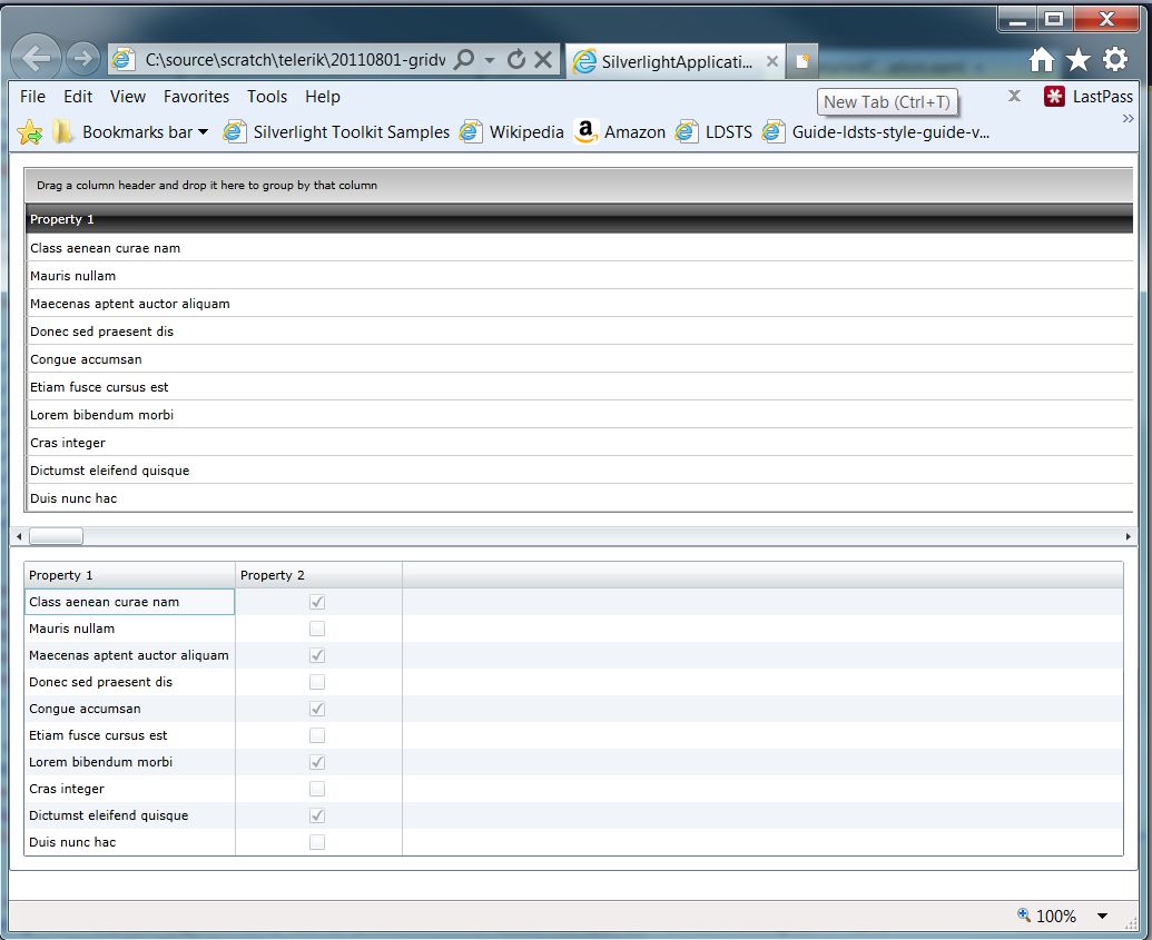 <Grid x:Name="LayoutRoot" Background="White" DataContext="{Binding Source={StaticResource SampleDataSource}}"> <StackPanel> <ScrollViewer HorizontalScrollBarVisibility="Auto" VerticalScrollBarVisibility="Auto"> <telerik:RadGridView Margin="8" ItemsSource="{Binding Collection}" Style="{StaticResource RadGridViewStyle}" AutoGenerateColumns="False" IsReadOnly="True" RowIndicatorVisibility="Collapsed" VerticalContentAlignment="Stretch" VerticalAlignment="Stretch" ScrollMode="Deferred"> <telerik:RadGridView.Columns> <telerik:GridViewDataColumn Header="Property 1" DataMemberBinding="{Binding Path=Property1}" TextWrapping="Wrap" Width="7*"/> <telerik:GridViewDataColumn Header="Property 2" DataMemberBinding="{Binding Path=Property2}" TextWrapping="Wrap" Width="3*" /> </telerik:RadGridView.Columns> </telerik:RadGridView> </ScrollViewer> <ScrollViewer HorizontalScrollBarVisibility="Auto" VerticalScrollBarVisibility="Auto"> <sdk:DataGrid Margin="8" ItemsSource="{Binding Collection}" AutoGenerateColumns="False" IsReadOnly="True" VerticalContentAlignment="Stretch" ScrollViewer.HorizontalScrollBarVisibility="Auto" ScrollViewer.VerticalScrollBarVisibility="Auto"> <sdk:DataGrid.Columns> <sdk:DataGridTextColumn Header="Property 1" Binding="{Binding Path=Property1}" /> <sdk:DataGridCheckBoxColumn Header="Property 2" Binding="{Binding Path=Property2}" Width="*" MaxWidth="150" /> </sdk:DataGrid.Columns> </sdk:DataGrid> </ScrollViewer> </StackPanel></Grid>Mike