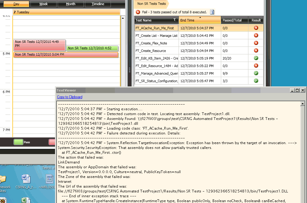 In the attachment, you can see the TestList failed twice at 4:49pm and 5:04pm. These were scheduled test runs. I ran the test list manually at 4:52 to verify it would work. It passed.