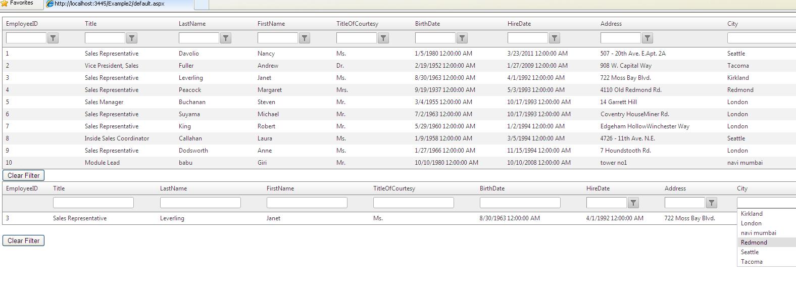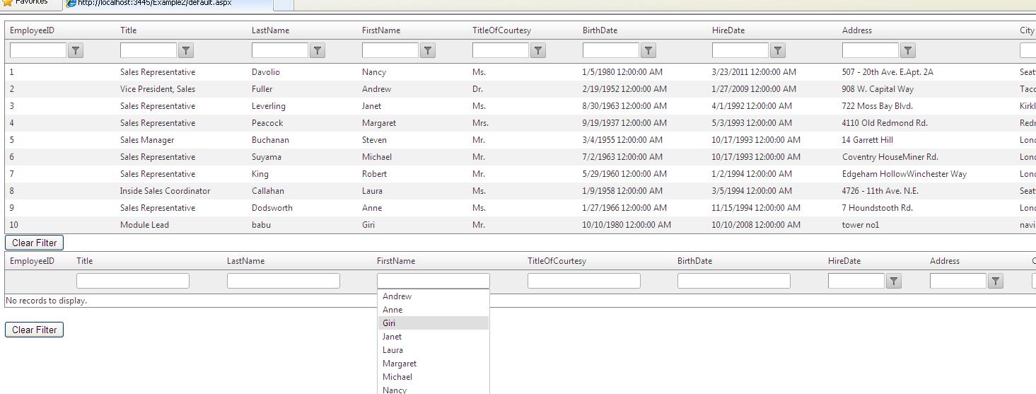 <%@ Control Language="C#" AutoEventWireup="true" CodeFile="GoogleFilterSample2.ascx.cs" Inherits="GoogleFilterSample2" %> <div> <telerik:RadGrid runat="server" EnableLinqExpressions="false" AllowFilteringByColumn="true" ID="RadGridUserControl" GridLines="None" OnNeedDataSource="RadGridUserControl_NeedDataSource"> <MasterTableView AutoGenerateColumns="False" DataKeyNames="EmployeeID"> <RowIndicatorColumn> <HeaderStyle Width="20px"></HeaderStyle> </RowIndicatorColumn> <ExpandCollapseColumn> <HeaderStyle Width="20px"></HeaderStyle> </ExpandCollapseColumn> <Columns> <telerik:GridBoundColumn DataField="EmployeeID" DataType="System.Int32" HeaderText="EmployeeID" ReadOnly="True" SortExpression="EmployeeID" UniqueName="EmployeeID" AllowFiltering="false"> </telerik:GridBoundColumn> <telerik:GridBoundColumn DataField="Title" HeaderText="Title" SortExpression="Title" UniqueName="Title"> <FilterTemplate> <telerik:RadComboBox runat="server" ID="FilterCombo" AutoPostBack="true" ShowToggleImage="false" MarkFirstMatch="true" OnClientSelectedIndexChanged="onClientSelectedIndexChangedTitle" OnItemsRequested="FilterCombo_ItemsRequested"> </telerik:RadComboBox> </FilterTemplate> </telerik:GridBoundColumn> <telerik:GridTemplateColumn DataField="LastName" HeaderText="LastName" SortExpression="LastName" UniqueName="LastName"> <FilterTemplate> <telerik:RadComboBox ID="RcbLastName" EnableLoadOnDemand="true" OnClientSelectedIndexChanged="onClientSelectedIndexChangedLN" runat="server" OnItemsRequested="RcbLastName_ItemsRequested" ShowToggleImage="false" MarkFirstMatch="true"> </telerik:RadComboBox> </FilterTemplate> <ItemTemplate> <%# Eval("LastName")%> </ItemTemplate> </telerik:GridTemplateColumn> <telerik:GridTemplateColumn DataField="FirstName" HeaderText="FirstName" SortExpression="FirstName" UniqueName="FirstName"> <FilterTemplate> <telerik:RadComboBox ID="RcbFirstName" EnableLoadOnDemand="true" OnClientSelectedIndexChanged="onClientSelectedIndexChangedFN" runat="server" OnItemsRequested="RcbFirstName_ItemsRequested" ShowToggleImage="false" MarkFirstMatch="true"> </telerik:RadComboBox> </FilterTemplate> <ItemTemplate> <%# Eval("FirstName")%> </ItemTemplate> </telerik:GridTemplateColumn> <telerik:GridTemplateColumn DataField="TitleOfCourtesy" HeaderText="TitleOfCourtesy" SortExpression="TitleOfCourtesy" UniqueName="TitleOfCourtesy"> <FilterTemplate> <telerik:RadComboBox ID="RcbTitleOfCourtesy" EnableLoadOnDemand="true" OnClientSelectedIndexChanged="onClientSelectedIndexChangedTitleOfCourtesy" runat="server" OnItemsRequested="RcbTitleOfCourtesy_ItemsRequested" ShowToggleImage="false" MarkFirstMatch="true"> </telerik:RadComboBox> </FilterTemplate> <ItemTemplate> <%# Eval("TitleOfCourtesy")%> </ItemTemplate> </telerik:GridTemplateColumn> <telerik:GridTemplateColumn DataField="BirthDate" HeaderText="BirthDate" SortExpression="BirthDate" UniqueName="BirthDate" DataType="System.DateTime"> <FilterTemplate> <telerik:RadComboBox ID="RcbBirthDate" EnableLoadOnDemand="true" OnClientSelectedIndexChanged="onClientSelectedIndexChangedBirthDate" runat="server" OnItemsRequested="RcbBirthDate_ItemsRequested" ShowToggleImage="false" MarkFirstMatch="true"> </telerik:RadComboBox> </FilterTemplate> <ItemTemplate> <%# Eval("BirthDate")%> </ItemTemplate> </telerik:GridTemplateColumn> <telerik:GridBoundColumn DataField="HireDate" DataType="System.DateTime" HeaderText="HireDate" SortExpression="HireDate" UniqueName="HireDate"> </telerik:GridBoundColumn> <telerik:GridBoundColumn DataField="Address" HeaderText="Address" SortExpression="Address" UniqueName="Address"> </telerik:GridBoundColumn> <telerik:GridTemplateColumn DataField="City" HeaderText="City" SortExpression="City" UniqueName="City"> <FilterTemplate> <telerik:RadComboBox ID="RcbCity" EnableLoadOnDemand="true" OnClientSelectedIndexChanged="onClientSelectedIndexChangedCity" runat="server" OnItemsRequested="RcbCity_ItemsRequested" ShowToggleImage="false" MarkFirstMatch="true"> </telerik:RadComboBox> </FilterTemplate> <ItemTemplate> <%# Eval("City")%> </ItemTemplate> </telerik:GridTemplateColumn> </Columns> </MasterTableView> </telerik:RadGrid><br /> <asp:Button ID="clrFilters" runat="server" Text="Clear Filter" OnClick="clrFilters_Click" /> <telerik:RadCodeBlock ID="RadCodeBlock1" runat="server"> <script type="text/javascript"> function onClientSelectedIndexChangedCity(sender, eventArgs) { var value = eventArgs.get_item().get_value(); $find("<%= RadGridUserControl.ClientID %>").get_masterTableView().filter("City", eventArgs.get_item().get_text(), "StartsWith"); } function onClientSelectedIndexChangedLN(sender, eventArgs) { var value = eventArgs.get_item().get_value(); $find("<%= RadGridUserControl.ClientID %>").get_masterTableView().filter("LastName", eventArgs.get_item().get_text(), "StartsWith"); } function onClientSelectedIndexChangedFN(sender, eventArgs) { var value = eventArgs.get_item().get_value(); $find("<%= RadGridUserControl.ClientID %>").get_masterTableView().filter("FirstName", eventArgs.get_item().get_text(), "StartsWith"); } function onClientSelectedIndexChangedTitle(sender, eventArgs) { var value = eventArgs.get_item().get_value(); $find("<%= RadGridUserControl.ClientID %>").get_masterTableView().filter("Title", eventArgs.get_item().get_text(), "StartsWith"); } function onClientSelectedIndexChangedTitleOfCourtesy(sender, eventArgs) { var value = eventArgs.get_item().get_value(); $find("<%= RadGridUserControl.ClientID %>").get_masterTableView().filter("TitleOfCourtesy", eventArgs.get_item().get_text(), "StartsWith"); } function onClientSelectedIndexChangedBirthDate(sender, eventArgs) { var value = eventArgs.get_item().get_value(); $find("<%= RadGridUserControl.ClientID %>").get_masterTableView().filter("BirthDate", eventArgs.get_item().get_text(), "StartsWith"); } </script> </telerik:RadCodeBlock> </div> using System; using System.Collections.Generic; using System.Linq; using System.Web; using System.Web.UI; using System.Web.UI.WebControls; using Telerik.Web.UI; us