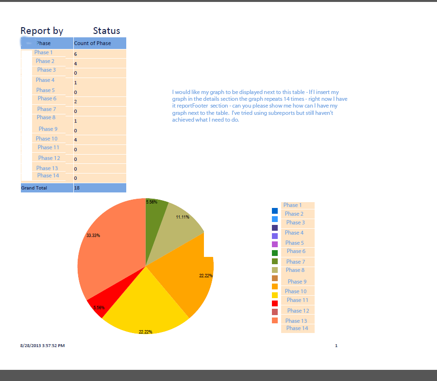 Please see the attached image for detailed description - what I need is my report (table) and the graph to be placed next to each other. If I place my graph in the details section the graph repeats. I've tried using sub report but still no success. Can you please tell me if its possible or not to have such format for the report.
