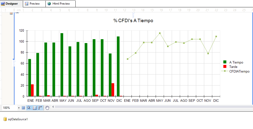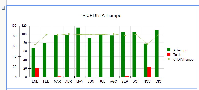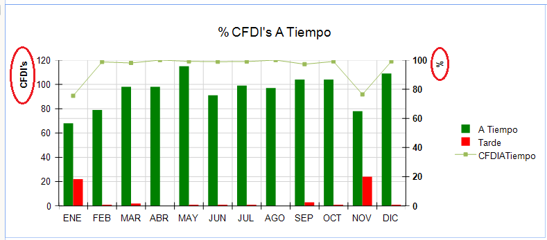 To set up the graph from your screenshot I recommend first setting up the graph with the two columns "CFDI's A Tiempo" and "CFDI's Tarde", then adding in the line for "% A Tiempo" last. When the graph is created with the first two columns, follow "How to Create Graph with Column and Line Series" to add in the line.