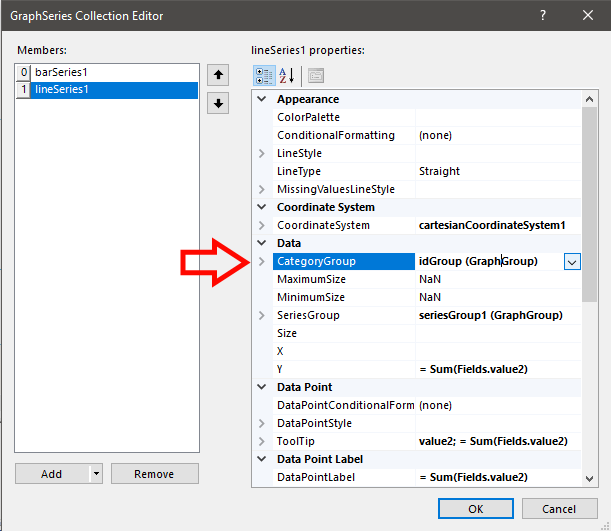 Thank for checking out my suggested articles. I believe after adding the new line-series, an extra category-group was created. Open up the 'GraphSeries Collection Editor' by clicking the '...' button in the Series properties of the Graph.