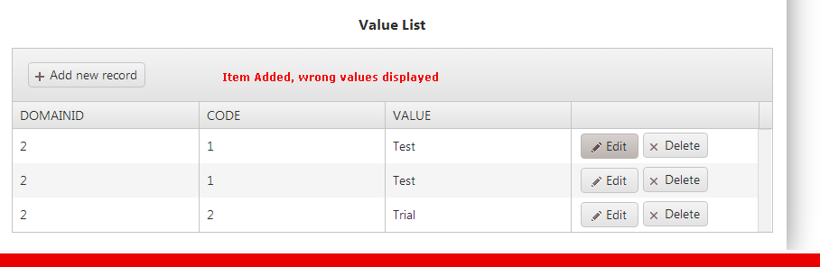 if I add a new object (6, trial, trial); the new object is correctly added to the database but the new object appears with the same values as the first one in grid (in this case with 5, test, test...