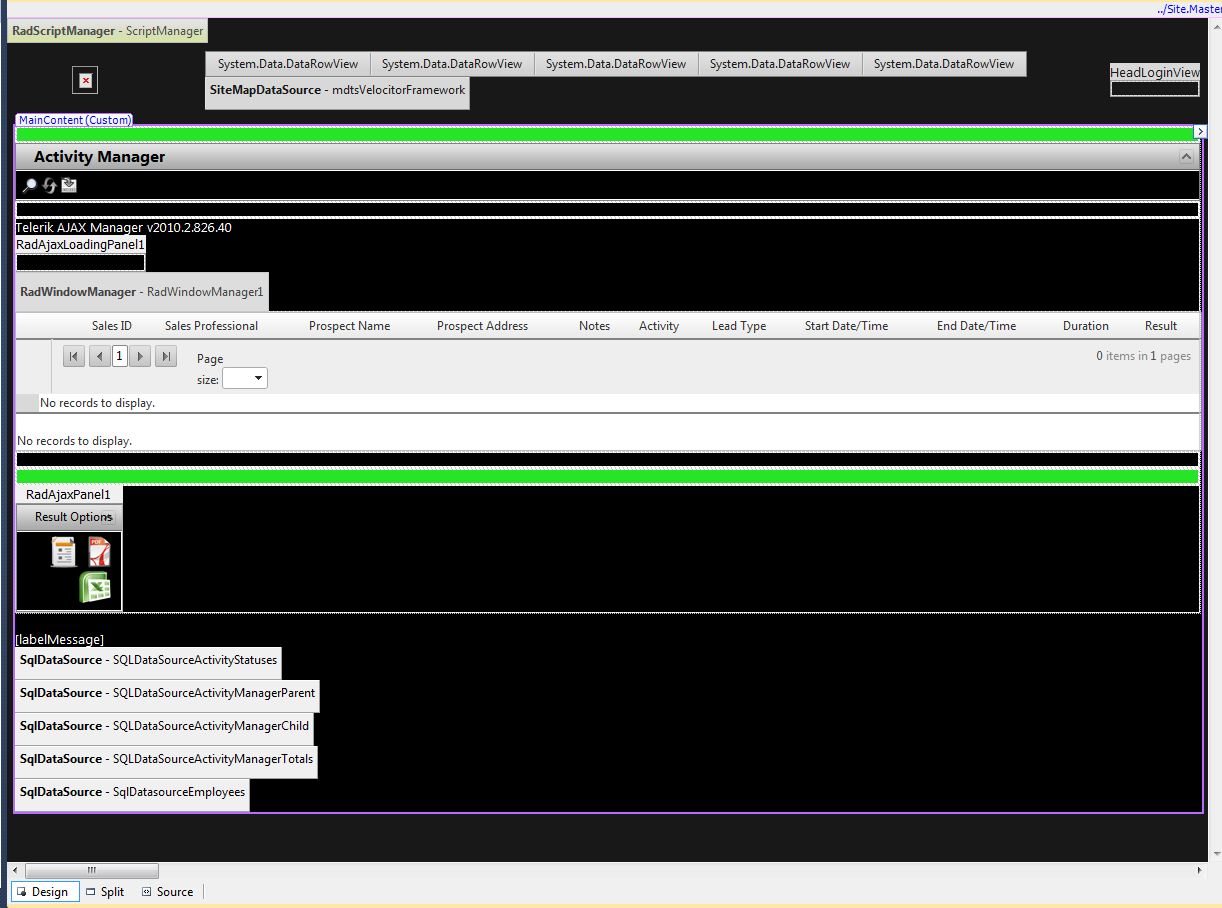 What design tool can I use for using RadControls within my aspx pages? It seems a though you don't have any control over the tools in design view. You have a hard code the tools via the source window. Any suggestions? I have attached an example image.