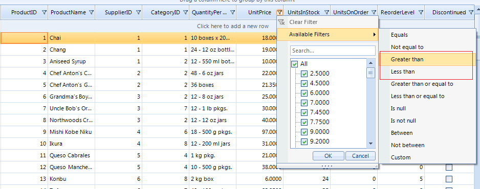 "Greater Than" and "Less Than" filter operators are available in the Excel-Like filtering popup for numeric columns. Please refer to the attached screenshot.