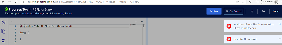 Can you provide more information about not being able to run the Telerik Blazor REPL snippet? Can you send some screenshots or a video what happens on your side when you click on the "Run" button in the top right part of the app? Are there any errors logged in the DevTools console that you can share?