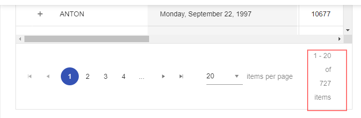 Currently, in the grid, there is a Info section displayed the numbers of rows are being displayed. The displayed text is, for example: "1 - 20 of 727 items".