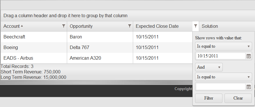 Thanks to the Kendo staff for getting me on track with my date handling (separate thread post). I have run across some odd behavior in the grid. I am now properly showing data in the grid using Javascript Date objects, which allows for proper sorting / filtering. What I have found is that while I can filter by a date properly, if I use grouping function on a date column, it breaks out each date as it's own group (see attached files for a FILTER snap and a GROUP snap on the same data).