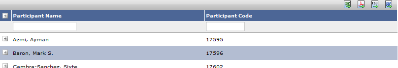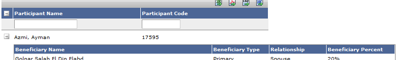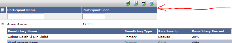 <asp:Content ID="Content1" ContentPlaceHolderID="ContentPlaceHolder1" runat="Server"> <link href="../../App_Themes/MBen/Grid.MBen.css" rel="stylesheet" type="text/css" /> <asp:ScriptManagerProxy ID="ScriptManagerProxy1" runat="server"> </asp:ScriptManagerProxy> <telerik:RadAjaxManagerProxy ID="RadAJAXManagerProxy1" runat="server"> <AjaxSettings> <telerik:AjaxSetting AjaxControlID="rgBeneficiary"> <UpdatedControls> <telerik:AjaxUpdatedControl ControlID="rgBeneficiary" LoadingPanelID="RadAjaxLoadingPanel1" /> </UpdatedControls> </telerik:AjaxSetting> </AjaxSettings> </telerik:RadAjaxManagerProxy> <table border="0" cellpadding="0" cellspacing="0" width="100%"> <tr> <td> <telerik:RadGrid ID="rgBeneficiary" runat="server" GridLines="Vertical" AllowPaging="true" AllowAutomaticUpdates="false" AllowAutomaticInserts="false" AutoGenerateColumns="False" EnableLinqExpressions="false" AllowSorting="true" AllowAutomaticDeletes="false" Skin="MBen" EnableEmbeddedSkins="false" DataSourceID="_dataSrcBeneficiaries" AllowCustomPaging="false" AllowFilteringByColumn="true" Width="100%" OnPreRender="rgBeneficiary_PreRender" OnItemCommand="rgBeneficiary_ItemCommand" OnItemCreated="rgBeneficiary_ItemCreated" PageSize="15" ImagesPath="../../App_Themes/MBen/Grid"> <MasterTableView TableLayout="Fixed" HierarchyDefaultExpanded="false" ClientDataKeyNames="EmployeeID, ParticipantID" HierarchyLoadMode="ServerBind" CommandItemDisplay="Top" DataKeyNames="EmployeeID, ParticipantID" ExpandCollapseColumn-CollapseImageUrl="../../App_Themes/MBen/Grid/Collapse.gif" ExpandCollapseColumn-Display="false" RowIndicatorColumn-Display="false" ExpandCollapseColumn-ExpandImageUrl="../../App_Themes/MBen/Grid/Expand.gif"> <CommandItemSettings ShowRefreshButton="false" ShowExportToExcelButton="true" ExportToExcelText="" ExportToCsvText="" ExportToPdfText="" ExportToWordText="" ShowExportToPdfButton="true" ShowExportToWordButton="true" ShowExportToCsvButton="true" ShowAddNewRecordButton="false" /> <NoRecordsTemplate> <div style="color: Red; font-size: 12px; font-family: Verdana, Arial, Helvetica, sans-serif; font-weight: bold"> <br /> Please select a plan to show activity for the specific plan. </div> </NoRecordsTemplate> <Columns> <telerik:GridTemplateColumn UniqueName="TemplateColumn" AllowFiltering="false" HeaderStyle-Width="3%"> <ItemTemplate> <asp:ImageButton ID="btnCollapse" runat="server" CommandName="ExpandCollapse" ImageUrl="~/App_Themes/MBen/Grid/Collapse.gif" ToolTip="Collapse" Visible="False " /> <asp:ImageButton ID="btnExpand" runat="server" CommandName="ExpandCollapse" ImageUrl="~/App_Themes/MBen/Grid/Expand.gif" ToolTip="Expand" /> </ItemTemplate> <HeaderTemplate> <asp:ImageButton ID="ExpandAll" runat="server" CommandName="ExpandAll" ImageUrl="~/App_Themes/MBen/Grid/Expand.gif" ToolTip="ExpandAll" /> <asp:ImageButton ID="CollapseAll" runat="server" CommandName="CollapseAll" Visible="False" ImageUrl="~//App_Themes/MBen/Grid/Collapse.gif" ToolTip="CollapseAll" /> </HeaderTemplate> </telerik:GridTemplateColumn> <telerik:GridBoundColumn DataField="ParticipantID" UniqueName="ParticipantID" Visible="false"> </telerik:GridBoundColumn> <telerik:GridBoundColumn DataField="EmployeeID" UniqueName="EmployeeID" Visible="false"> </telerik:GridBoundColumn> <telerik:GridBoundColumn DataField="FullName" UniqueName="FullName" HeaderText="Participant Name" CurrentFilterFunction="Contains" ShowFilterIcon="false" AutoPostBackOnFilter="true" FilterControlWidth="125px" FilterControlToolTip="Input name or part of name to search" HeaderStyle-Width="50%"> </telerik:GridBoundColumn> <telerik:GridBoundColumn DataField="EmployeeCode" UniqueName="EmployeeCode" HeaderText="Participant Code" CurrentFilterFunction="Contains" ShowFilterIcon="false" AutoPostBackOnFilter="true" FilterControlWidth="75px" FilterControlToolTip="Input a code to search" HeaderStyle-Width="50%" /> </Columns> <DetailTables> <telerik:GridTableView DataKeyNames="BeneficiaryID" DataSourceID="_dataSrcParticipantBeneficiaries" TableLayout="Auto" runat="server" AllowFilteringByColumn="false" ShowFooter="true"> <ParentTableRelation> <telerik:GridRelationFields DetailKeyField="ParticipantID" MasterKeyField="ParticipantID" /> </ParentTableRelation> <Columns> <telerik:GridBoundColumn DataField="BeneficiaryID" UniqueName="BeneficiaryID" Visible="false"> </telerik:GridBoundColumn> <telerik:GridBoundColumn DataField="Beneficiary" UniqueName="Beneficiary" HeaderText="Beneficiary Name" AllowFiltering="false"> </telerik:GridBoundColumn> <telerik:GridBoundColumn DataField="BeneficiaryType" UniqueName="BeneficiaryType" HeaderText="Beneficiary Type" HeaderStyle-Width="15%"> </telerik:GridBoundColumn> <telerik:GridBoundColumn DataField="BeneficiaryRelationship" UniqueName="BeneficiaryRelationship" HeaderText="Relationship" AllowFiltering="false" HeaderStyle-Width="15%"> </telerik:GridBoundColumn> <telerik:GridBoundColumn DataField="BeneficiaryPercent" UniqueName="BeneficiaryPercent" HeaderText="Beneficiary Percent" AllowFiltering="false" HeaderStyle-Width="18%"> </telerik:GridBoundColumn> </Columns> </telerik:GridTableView> </DetailTables> <ExpandCollapseColumn Visible="True"> </ExpandCollapseColumn> <RowIndicatorColumn Visible="false"> </RowIndicatorColumn> </MasterTableView> <ExportSettings ExportOnlyData="true" IgnorePaging="true" FileName="Export" OpenInNewWindow="true"> <Pdf PaperSize="A4" PageLeftMargin="5px" PageRightMargin="5px" PageWidth="297mm" PageHeight="210mm" /> </ExportSettings> </telerik:RadGrid> </td> </tr> </table> <asp:ObjectDataSource ID="_dataSrcBeneficiaries" runat="server" SelectMethod="ListByPlan" TypeName="DBLib.Beneficiary"> <SelectParameters> <asp:ProfileParameter Name="PlanID" PropertyName="PlanID" DefaultValue="-1" Type="Int32" /> </SelectParameters> </asp:ObjectDataSource> <asp:ObjectDataSource ID="_dataSrcParticipantBeneficiaries" runat="server" SelectMethod="ListByParticipant" TypeName="DBLib.Beneficiary"> <SelectParameters> <asp:SessionParameter Name="ParticipantID" Sess