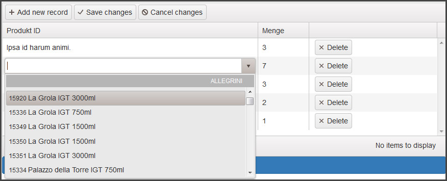 01.function produktDropDownEditor(container, options) {02. $('<input required data-value-field="produkt_id" data-text-field="produkt_name" data-bind="value:' + options.field + '"/>')03. .appendTo(container)04. .kendoComboBox({05. optionLabel: "Artikel auswaehlen..",06. autoBind: false,07. minLength: 3,08. filter: "contains",09. template: '<small>#: produkt_id # </small> #: produkt_name # #: produkt_cc #ml',10. fixedGroupTemplate: "#:data#",11. dataSource: {12. type: "json",13. transport: {14. read: crudServiceBaseUrl + "/productsJson",15. dataType: "json"16. },17. group: { field: "produkt_kellerei" },18. schema: {19. data:'data'20. }21. }22. });23.}I attached two images where you can see that everything (grouping) looks good in the dropdown but after selecting the grid throws out "undefined".