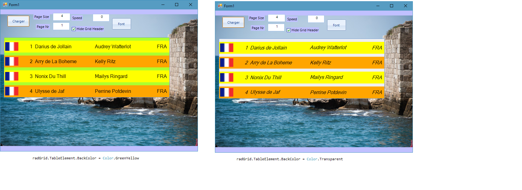 this.BackgroundImage = Properties.Resources.Nice;this.radGridView1.TableElement.BackColor = Color.Transparent;this.radGridView1.RootElement.BackColor = Color.Transparent;I hope this information helps. If you have any additional questions, please let me know.