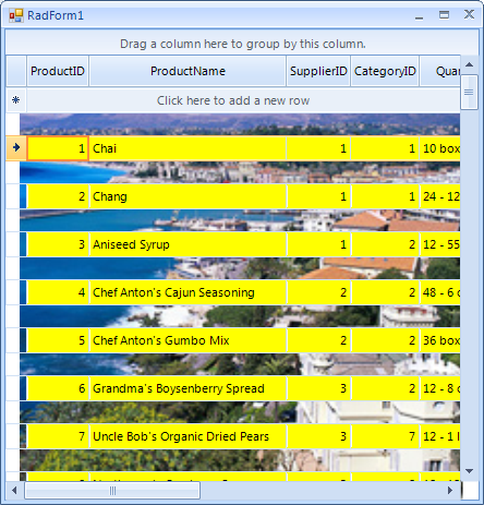 public RadForm1(){ InitializeComponent(); this.radGridView1.TableElement.RowSpacing = 20; this.radGridView1.CellFormatting+=radGridView1_CellFormatting; this.radGridView1.TableElement.BackgroundImage = Properties.Resources.Nice; this.radGridView1.TableElement.BackgroundImageLayout = ImageLayout.Zoom;}private void radGridView1_CellFormatting(object sender, Telerik.WinControls.UI.CellFormattingEventArgs e){ e.CellElement.DrawFill = true; e.CellElement.BackColor = Color.Yellow; e.CellElement.GradientStyle = Telerik.WinControls.GradientStyles.Solid;}I hope this information helps. Should you have further questions I would be glad to help.