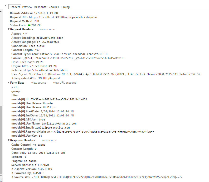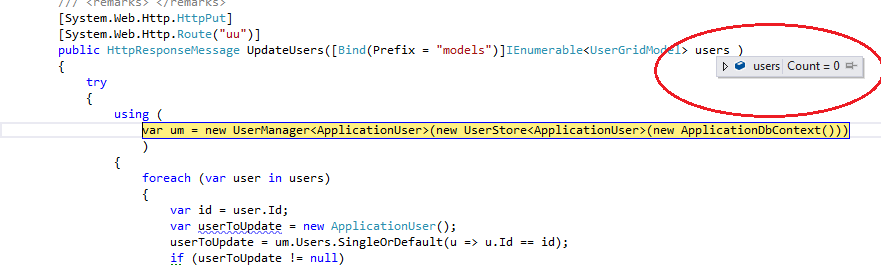 /// <summary>/// Updates user(s) in GMCMembership System with changes made in Kendo Grid/// </summary>/// <param name="users"></param>/// <remarks> </remarks>[System.Web.Http.HttpPut][System.Web.Http.Route("uu")]public HttpResponseMessage UpdateUsers([Bind(Prefix = "models")]IEnumerable<UserGridModel> users ){ try { using ( var um = new UserManager<ApplicationUser>(new UserStore<ApplicationUser>(new ApplicationDbContext())) ) { foreach (var user in users) { var id = user.Id; var userToUpdate = new ApplicationUser(); userToUpdate = um.Users.SingleOrDefault(u => u.Id == id); if (userToUpdate != null) { userToUpdate.Email = user.Email; userToUpdate.EndDate = (DateTime)user.EndDate; userToUpdate.IsBIUser = user.IsBIUser; userToUpdate.StartDate = (DateTime)user.StartDate; userToUpdate.UserFName = user.UserFName; userToUpdate.UserLName = user.UserLName; userToUpdate.UserName = user.UserName; um.Update(userToUpdate); } } } return Request.CreateResponse(HttpStatusCode.OK); } catch (Exception ex) { Elmah.ErrorSignal.FromCurrentContext().Raise(ex); return Request.CreateErrorResponse(HttpStatusCode.BadRequest, ex); }}Thanks!