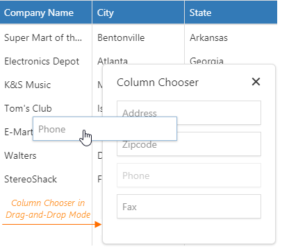 We want to allow user to drag and drop to show/hide columns from a column chooser box. We want to allow user to be able to drag a column from the list box and drop it in the column header of the grid. So it will be easy for user to design their grid columns layout. Is there an example to do that?