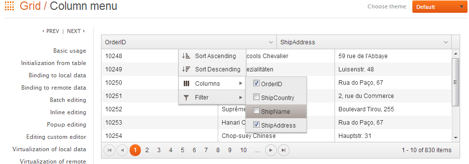 I've downloaded the latest version of Kendo Web (kendoui.web.2012.2.710.open-source) and added a grid in my application with the following settings: